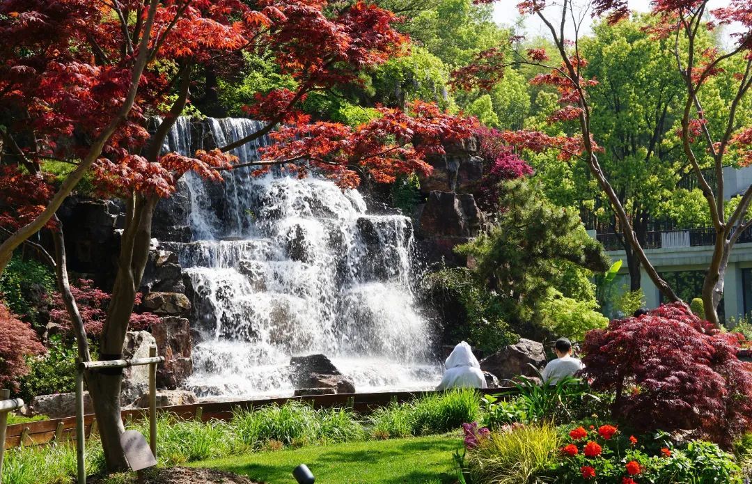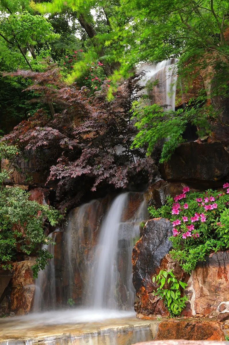 自假山上倾泻而下的瀑布潺潺