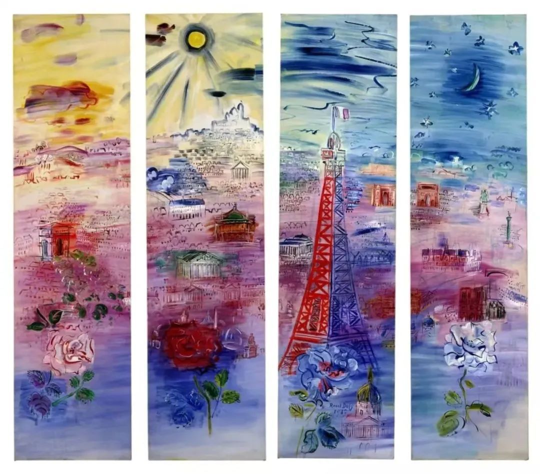 1925 年,巴黎高等美术学院请杜菲创作一系列以巴黎为主题的椅子等家具类装饰品,其中也包括屏风。他在博韦的挂毯工厂的协助下制作了有把手的椅子和沙发等,并在各种椅子的椅背上画了埃菲尔铁塔、凯旋门等象征巴黎的历史性建筑。本作创作于 1937 年,是用屏风的形式表现俯瞰巴黎的作品。画面中同时出现了月亮和太阳,蓝色调表现夜晚,黄色调体现阳光。前景中四朵硕大的玫瑰是杜菲常用的景物,巧妙地将时间和空间组合在一起,为繁华的艺术之都巴黎的形象增添华彩。