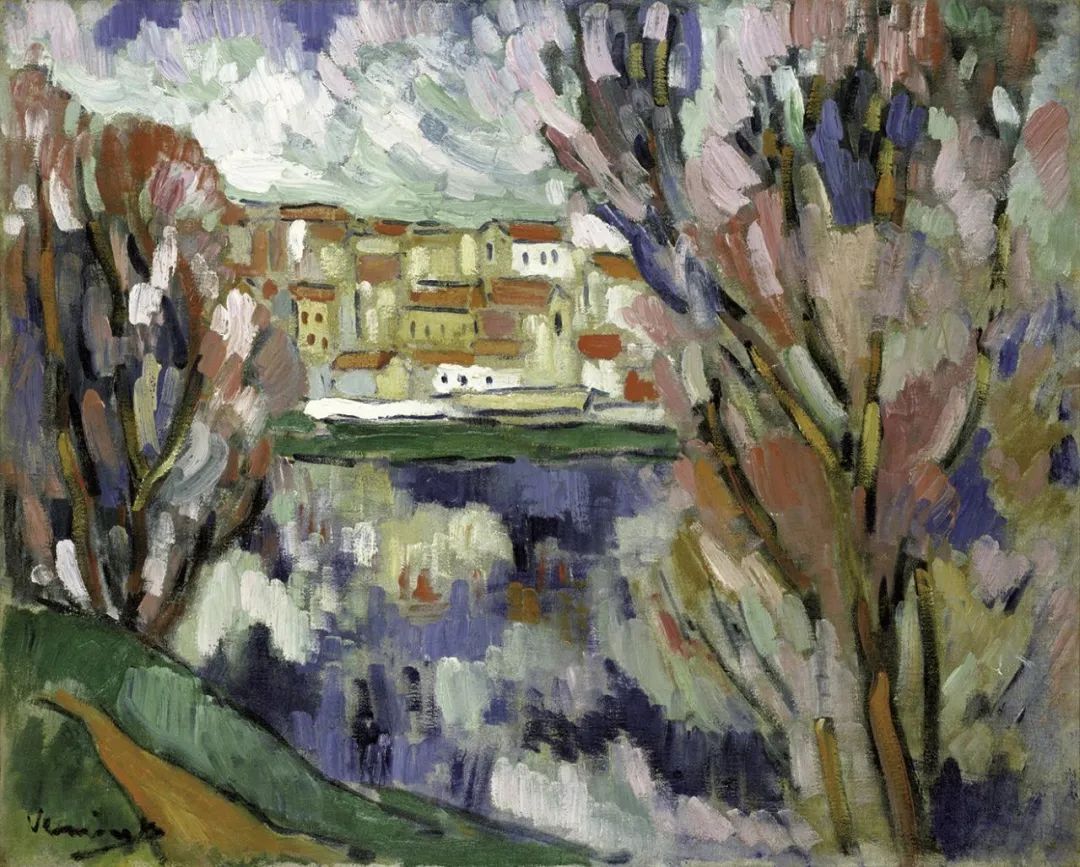 该作创作于 1906 年前后,河对面一排排红顶小屋和画面两侧的绿树组成了稳定的构图。此时他正研究塞尚的绘画,在野兽派明快的色彩上增添了前所未有的透明感。他以奔放的笔触,运用明亮的红、绿、蓝和清澄的白色描绘了塞纳河畔的风景。