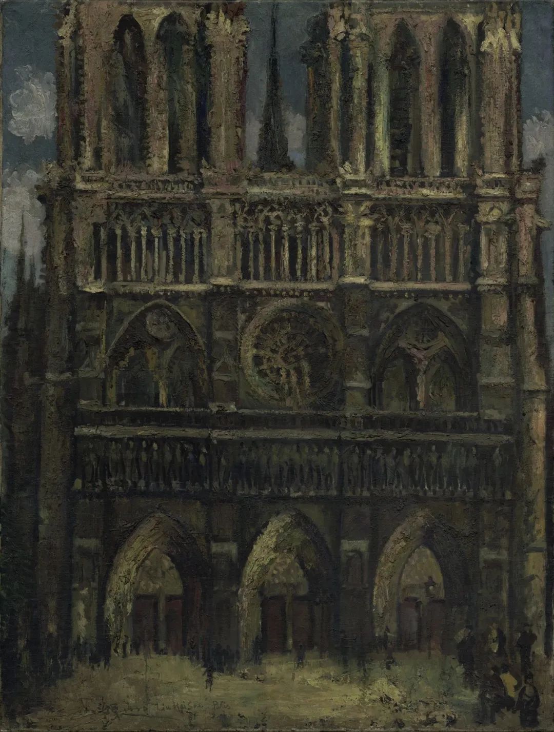 1929 年至 1935 年,刘海粟先后两次游历欧洲,该作是他第一次旅欧期间的力作,也是他 20 世纪 30 年代的代表作之一。刘海粟深受印象派的影响,莫奈曾在 1892 年至 1893 年间,描绘了在晨曦、日出、正午、薄暮等各种光线下的巴黎圣母院系列作品,本作中也可以看到莫奈的渊源。除了光线变幻之外,刘海粟似乎更注重整个画面的沉稳和均衡,对称的构图在黄绿色的暖调子中展开,笔致沉厚而有弹性,驭色错综而有序,不愧为中国现代美术史上的佳作。