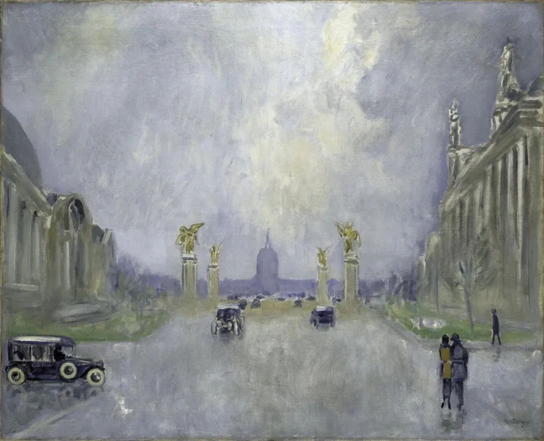 塞纳河孕育了巴黎。塞纳河上最壮观、最金碧辉煌装饰的是于1900年落成的亚历山大三世桥,它也被认为是巴黎最漂亮的一座拱桥。在东根描绘的这幅画中,当站在塞纳河右岸的克莱蒙梭广场,隔着壮丽的亚历山大三世桥就能看到通往荣军院大道的景色。荣军院位于塞纳河左岸,内有拿破仑的墓地。这幅作品构图左右对称,画面中央是雨后漂浮着云朵的天空,右侧是为 1900 年巴黎世博会建造的巴黎大皇宫,左侧是小皇宫博物馆。在巴黎的历史建筑前行驶着当时刚刚出现的汽车,描绘了一派走向现代的繁华景象。