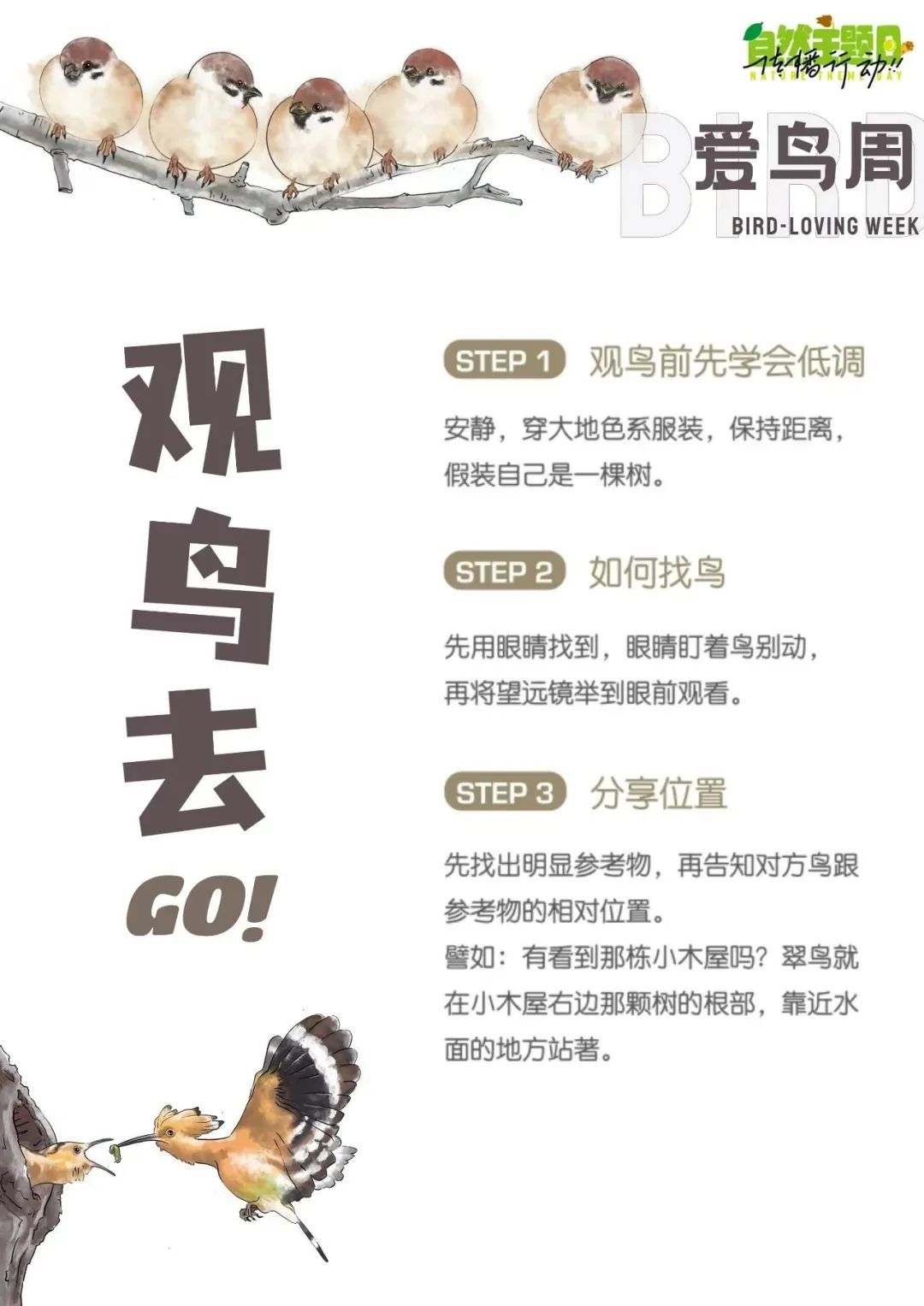 2.观赏自然界的野生鸟类,不要引诱、驱赶或惊吓鸟儿,不要为满足好奇心而对小鸟穷追不舍;