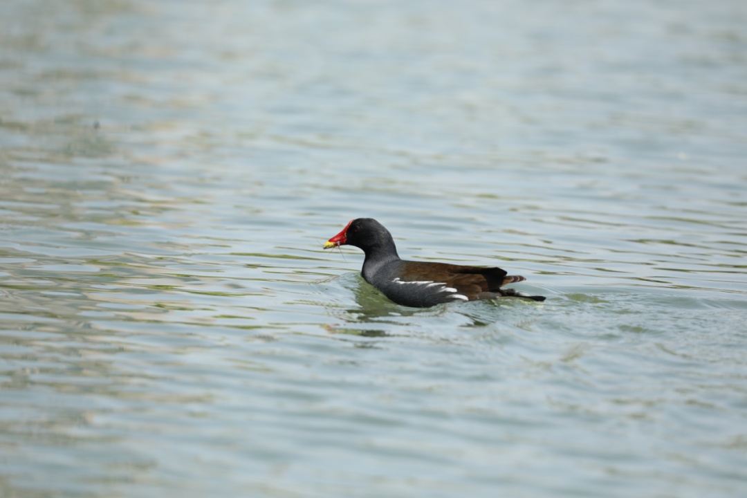 不远处的湖面上,小鷿鷈悠闲地梳理着羽毛,忽见黑水鸡猛地扎入水中,再浮起时已倏地叼起一尾银鱼,溅起一圈晶莹水花;