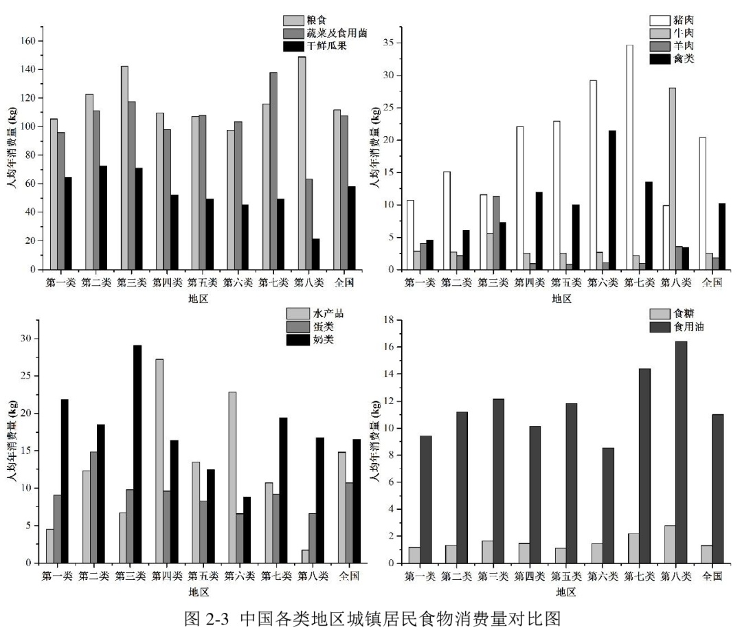 结果显示,食物选择与地理环境(距海距离、海拔、平均气温、相对湿度、降水量等)紧密联系,川渝地区蔬菜及食用菌消费为全国最高,西藏地区粮食和食用油消费最高,新疆与内蒙古的奶类消费最高,东南沿海地区水产品消费量最高。