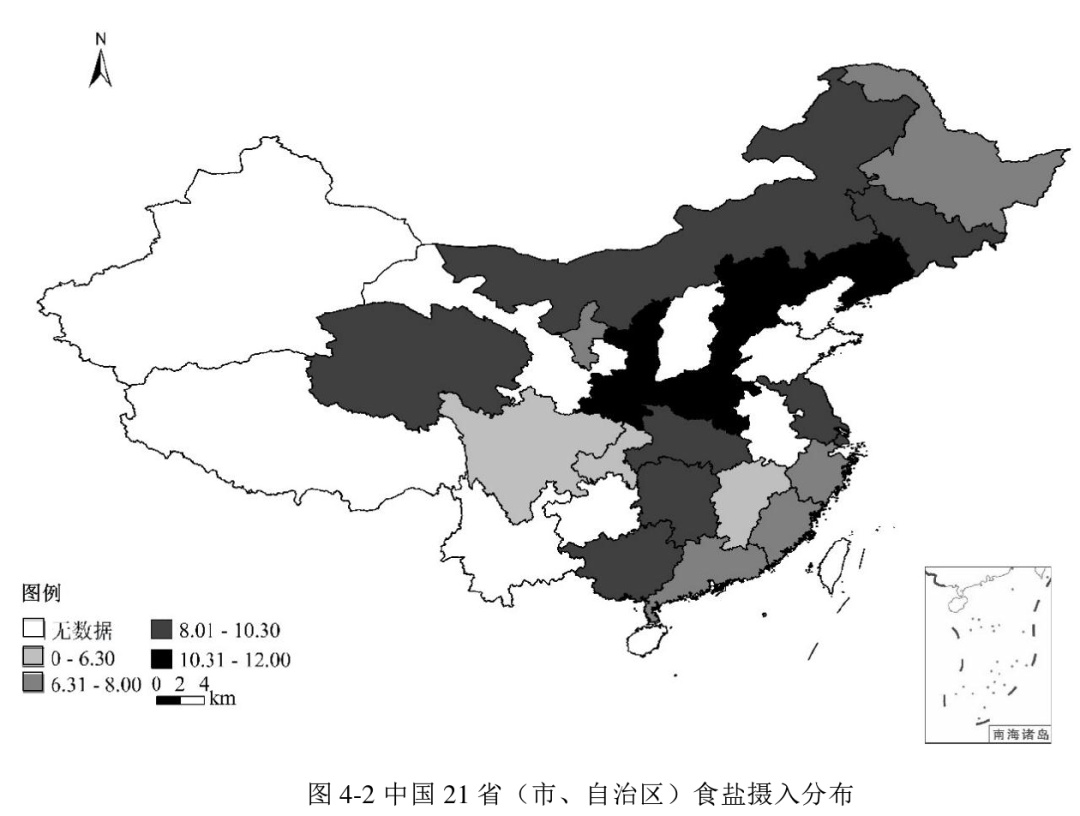 食盐摄入分布,总体上有北方高于南方的趋势。河南盐摄入量最高,人均日摄入12g,北京、辽宁、陕西其次,为11.7g,四川最低,为5.6g | 参考文献[7]