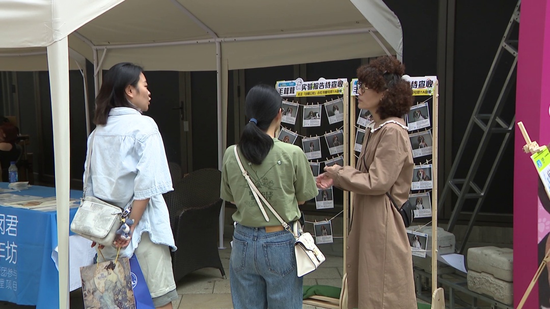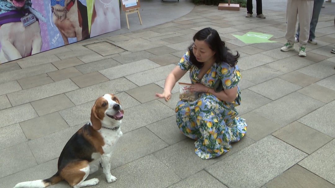 在领养实验犬摊位前,前来了解相关情况的爱心人士络绎不绝。市民王女士在七年前就领养了一只被遗弃的流浪犬比格。当时只有2个月大小的比格体弱多病,经过王女士的精心呵护以及耐心训练,如今比格已经恢复健康,且能够与人相互交流,根据主人的口令,与主人握手、击掌等都不在话下,人与狗狗其乐融融。