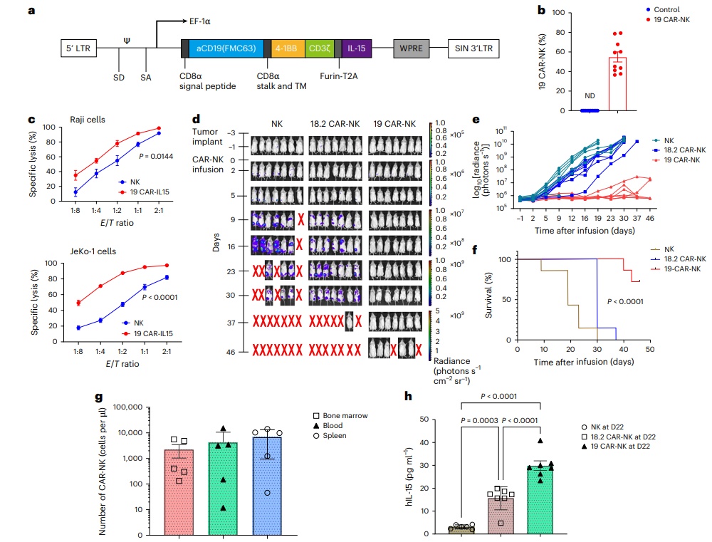 浙江大学钱文斌、同济大学附属同济医院梁爱斌、孙毅、西湖大学童向民团队联合开展了关于CD19特异性CAR-NK(嵌合抗原受体自然杀伤细胞)疗法在治疗复发/难治性大B细胞淋巴瘤(LBCL)中的安全性、可行性和疗效的研究。研究包括了临床前模型的实验和一项单臂、开放标签的1期临床试验。相关内容以“Safety and feasibility of 4-1BB co-stimulated CD19-specific CAR-NK cell therapy in refractory/relapsed large B cell lymphoma: a phase 1 trial”为题发表在《Nature Cancer》上。