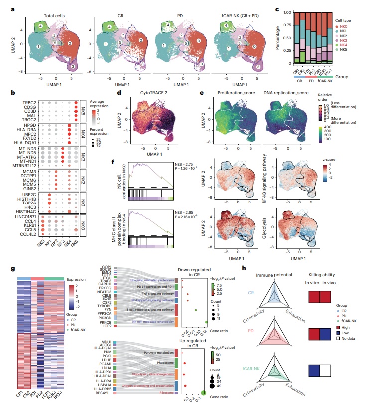 通过单细胞RNA测序分析了CAR-NK细胞产品的转录组特征。研究者从7份CAR-NK细胞产品中鉴定出6个不同的NK细胞亚群,每个亚群具有独特的基因表达特征。与部分缓解(PD)相关的CAR-NK细胞产品相比,完全缓解(CR)相关的CAR-NK细胞产品中NK4亚群比例更高,且该亚群表现出较低的分化程度和较高的增殖能力。此外,CR组的CAR-NK细胞产品中与免疫潜力相关的基因集表达较高,而PD组中与细胞毒性相关的基因集表达较高,表明CAR-NK细胞的特定亚群和基因表达特征与治疗效果相关。