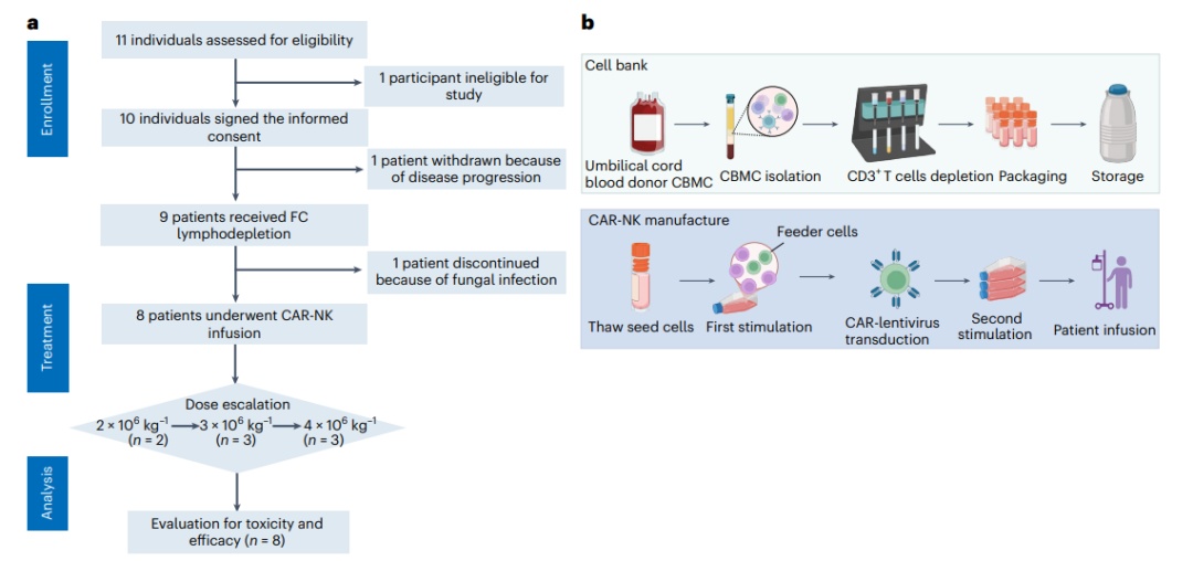 图中描述了1期临床试验的设计和CAR-NK细胞的制备流程。研究共筛选了11名患者,最终9名符合条件并接受了治疗。CAR-NK细胞的制备包括从脐带血中分离单个核细胞(CBMCs),去除CD3+ T细胞后进行冷冻保存。在制备过程中,通过两轮刺激和CAR转导,最终生成用于患者输注的CAR-NK细胞。图中还展示了患者的筛选、入组、治疗和分析流程,以及CAR-NK细胞制造的具体步骤。
