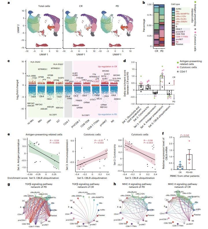 图中展示了接受CAR-NK细胞治疗的患者外周血单个核细胞(PBMCs)的单细胞转录组分析结果。研究者从5名患者(3名CR和2名PD)中鉴定出15个不同的免疫细胞亚群,并分析了这些亚群在CR和PD患者之间的差异。结果显示,CR患者的PBMCs中与抗原呈递和细胞毒性相关的细胞亚群比例更高,而PD患者的PBMCs中与免疫抑制相关的细胞亚群比例更高。此外,CBLB介导的泛素化在PD患者的PBMCs中显著上调,且与免疫抑制信号通路相关,表明宿主免疫状态对CAR-NK细胞治疗的疗效有重要影响。