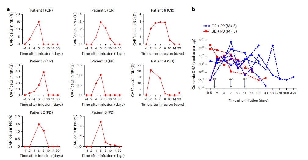 图中展示了CAR-NK细胞在患者体内的扩增和持续性。通过流式细胞术和数字滴度PCR(ddPCR)检测患者外周血中CAR-NK细胞的数量和CAR基因拷贝数。结果显示,患者在接受CAR-NK细胞输注后4-7天,CAR-NK细胞数量达到高峰,且在响应治疗的患者中观察到CAR-NK细胞的长期持续存在,甚至在一名达到CR的患者中,CAR基因拷贝数在输注后15个月仍可检测到,表明CAR-NK细胞的持续性与治疗反应密切相关。