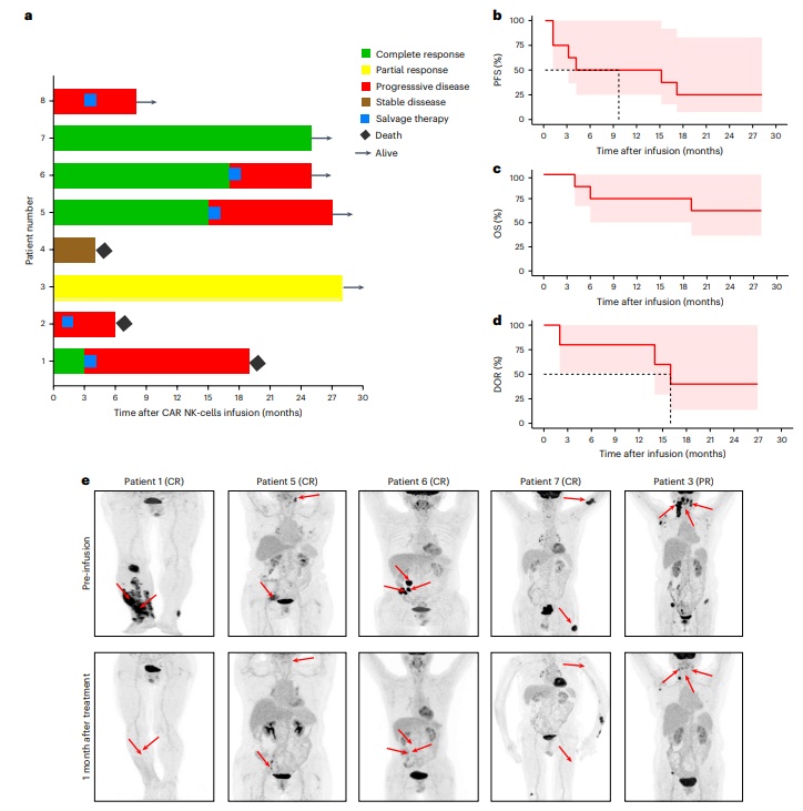 进一步总结了CD19-BBz CAR-NK细胞治疗的临床疗效。结果显示,8名接受治疗的患者中,总体反应率为62.5%(5/8),其中50%(4/8)的患者达到完全缓解(CR)。中位无进展生存期(PFS)为9.5个月,总生存期(OS)中位数尚未达到。通过PET-CT扫描对比治疗前后的肿瘤负荷,可以看到响应治疗的患者肿瘤显著缩小或消失,表明CD19-BBz CAR-NK细胞治疗在复发/难治性LBCL患者中具有显著的抗肿瘤效果。