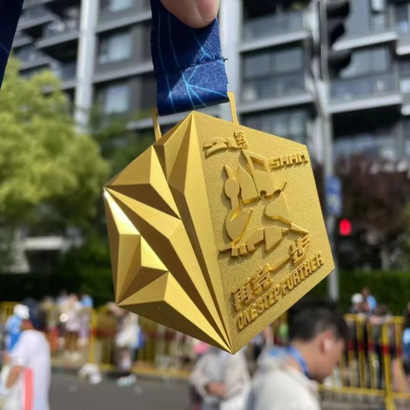 完赛奖牌也备受跑者期待。今年的完赛奖牌为金色,外沿采用六边形设计,是由“申”演变而来,寓意跑者在比赛中不断突破自我、“再竞一步”成为“六边形战士”。正面左侧采用了21面雕刻设计,即象征半马全程21.0975公里,也寓意选手们在赛道上和生活中可能遇到的困难和挑战,但只要勇于面对和化解,终能在 “21” 的这个数字里完成冲线;右半部分则将浦东地标与跑者图形交叠呈现,辅以21.0975的数字和赛事slogan,寓意为跑者用脚步丈量浦东最美风景线,暗合“江河奔流不止、竞赛精神不息”的双重意象。