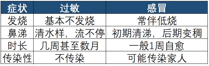 有了呼吸道的不适症状首先要区分到底是过敏,还是感冒,切勿随意乱吃药,可以对照下面表格了解两者的区别。