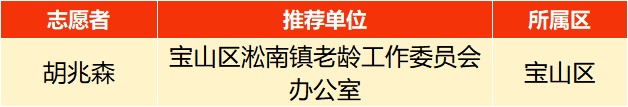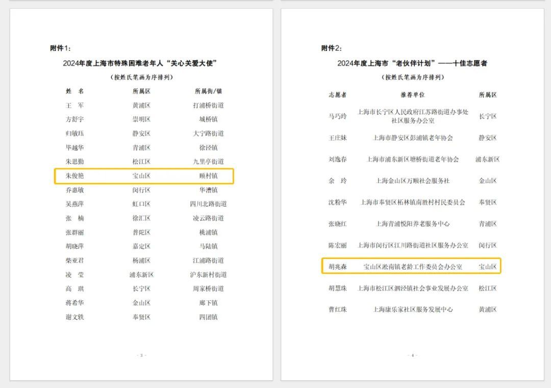 2024年9月,上海市养老服务发展中心组织开展了2024年度上海市特殊困难老年人“关心关爱大使”以及2024年度上海市“老伙伴计划”十佳志愿者评树活动,经过申报推荐、材料审核、专家评审等环节已于近期揭晓获奖名单,宝山2人榜上有名!