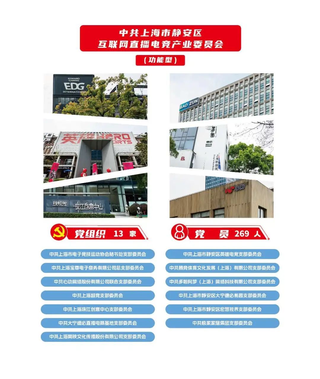 2024年,在市委组织部、区委组织部指导下,全市首个互联网直播电竞产业党委(功能型)在此成立,将新兴链主企业主导型和行业协会主导型产业链党建模式有机结合,涵盖13家党组织,覆盖党员269名。