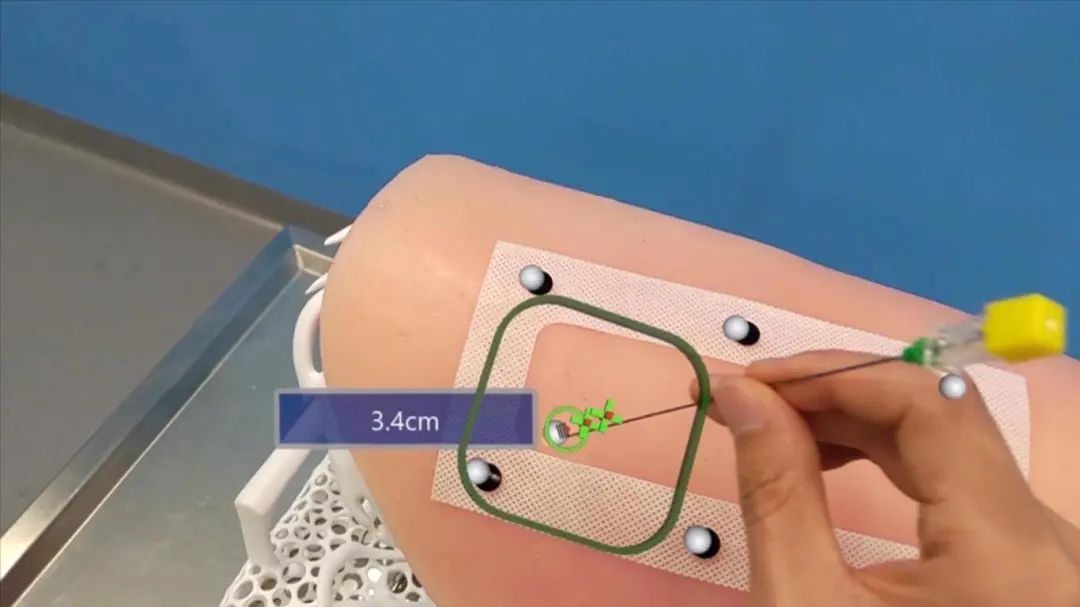 在模拟手术室,上海市胸科医院肿瘤科副主任成兴华演示了如何通过AR眼镜将虚拟画面和现实场景拟合重叠,让患者通过CT建模的三维肺部画面与现实中手术台上的患者肺部完全匹配,并且人工智能还精确标出进针位置,从而让医生能够为患者做更为精准的穿刺定位。