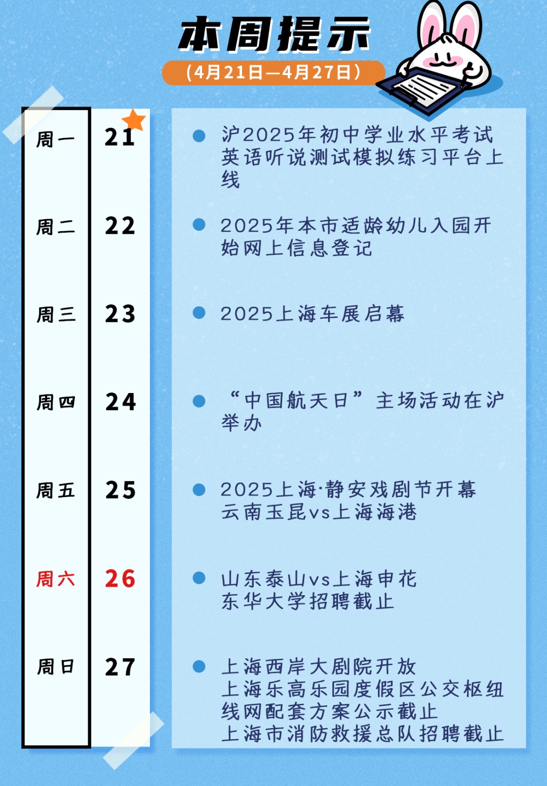 敲黑板!4月27日(星期日)是工作日,大家记得要上班!2025本市适龄幼儿入园周二起进行网上信息登记,2025上海车展周三启幕,“中国航天日”主场活动周四举办,上海西岸大剧院周日开放……本周还有哪些大事?速看本周提示↓