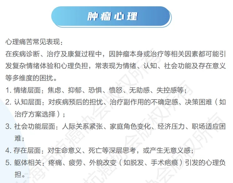 肿瘤心理干预:在癌症预防和康复需重视心理健康的作用,推荐重点关注某些关键时点如首次确诊后、手术前或化疗启动等治疗计划调整时、出现副作用时等的压力管理,推荐寻求专业心理咨询。