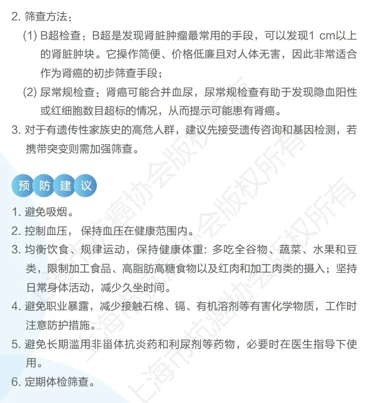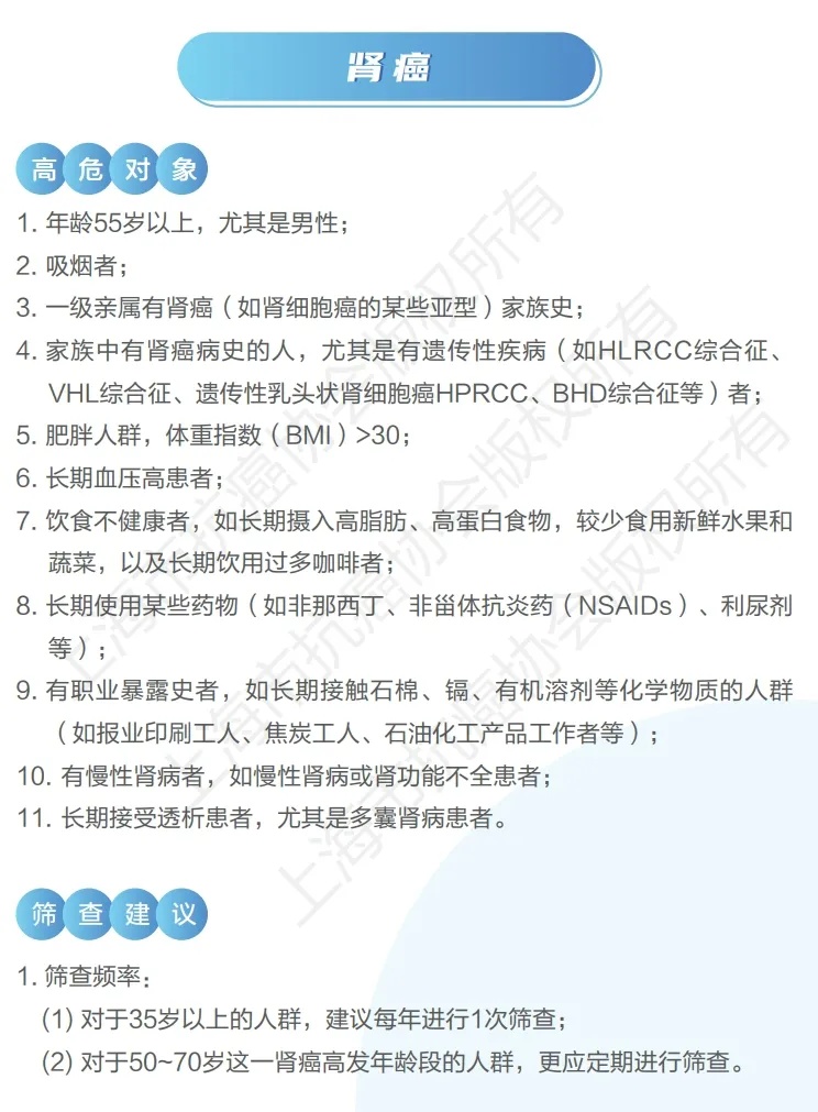 肾癌:建议55岁以上高危人群(如长期吸烟、肥胖者、慢性肾病患者)定期进行肾脏超声和尿常规检查。