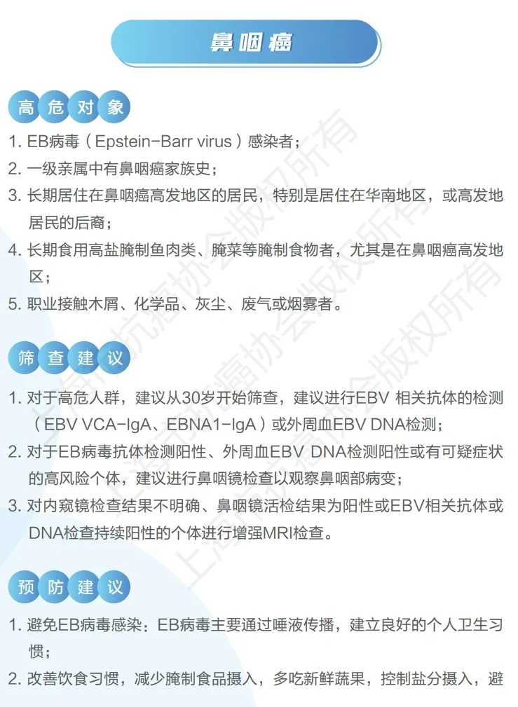 癌症是严重威胁我国居民健康的 一类慢性病 上海市卫生健康委近日公布 在上海 伴随人口老龄化程度加深 和生活方式的改变 癌症负担持续加重 最新监测数据显示,2021年上海新发癌症病例9.29万例,发病率为625/10万,发病前三位的癌症依次是肺癌、大肠癌和甲状腺癌;2021年全市有3.85万人因癌症而死亡,死亡率为259/10万,癌症仍是本市居民的第二位死因。 最新数据显示 上海癌症防治核心指标 稳步提升 ↓↓↓ 常见恶性肿瘤诊断时早期比例 提升至42.8% 总体癌症5年生存率 已达61.6% 均处于国内领先水平 近十年来,上海在全市范围开展社区居民大肠癌筛查,促进了大肠癌患者和前期病变患者的早诊早治,提高了患者生存质量、延长了生存期。2024年,为超过59万居民提供了筛查服务,已发现癌前期病变6145例、确诊大肠癌745例。今年,本市将围绕“50岁以上人人参加一次大肠癌筛查”目标,继续向超过50万居民提供免费的大肠癌筛查服务。 2023年起,上海依托加强公共卫生体系建设三年行动计划,在全市16个区的50个社区卫生服务中心开展肺癌、大肠癌、食管癌、胃癌、肝癌、乳腺癌和宫颈癌7种常见癌症综合风险评估和筛查管理。截至2024年底,已为16.8万居民提供综合风险评估服务和个性化健康教育,发现癌症高风险9.6万人,并提供了临床检查建议和便捷转诊引导。 今年起,上海将继续推广7种常见癌症综合风险评估和筛查管理,逐步覆盖所有社区卫生服务中心,并通过移动终端支持居民自助开展癌症风险评估。 4月15日-21日是第三十六届上海市肿瘤防治宣传周,今年的主题是“科学防癌,健康生活”。 市抗癌协会新版《居民常见恶性肿瘤筛查和预防推荐》正式发布,新增了鼻咽癌、肾癌、子宫内膜癌的筛查和预防建议,对2024版中的辐射与肿瘤、肿瘤心理、疫苗可预防癌症、胃癌、膀胱癌、儿童肿瘤、口腔癌等内容进行了修订。 2025版“推荐”共涉及24个瘤种,涵盖目前全国人口94%、上海市居民95%以上的恶性肿瘤新发病例; “推荐”中还包含儿童肿瘤、遗传性癌症和疫苗可预防癌症等三个癌症专题,提供了七个降低常见癌症风险的专业建议,以及一张分性别和年龄段的癌症筛查推荐时间表,为公众提供了全面、科学的防癌指导。 更多防癌知识 ↓↓↓ 向上滑动阅览 新增三大癌种筛查建议 早诊早治是关键 鼻咽癌:对于华南等高发地区人群及高危人群,推荐从30岁开始筛查,采用EB病毒抗体检测,阳性者联合鼻咽镜检查。