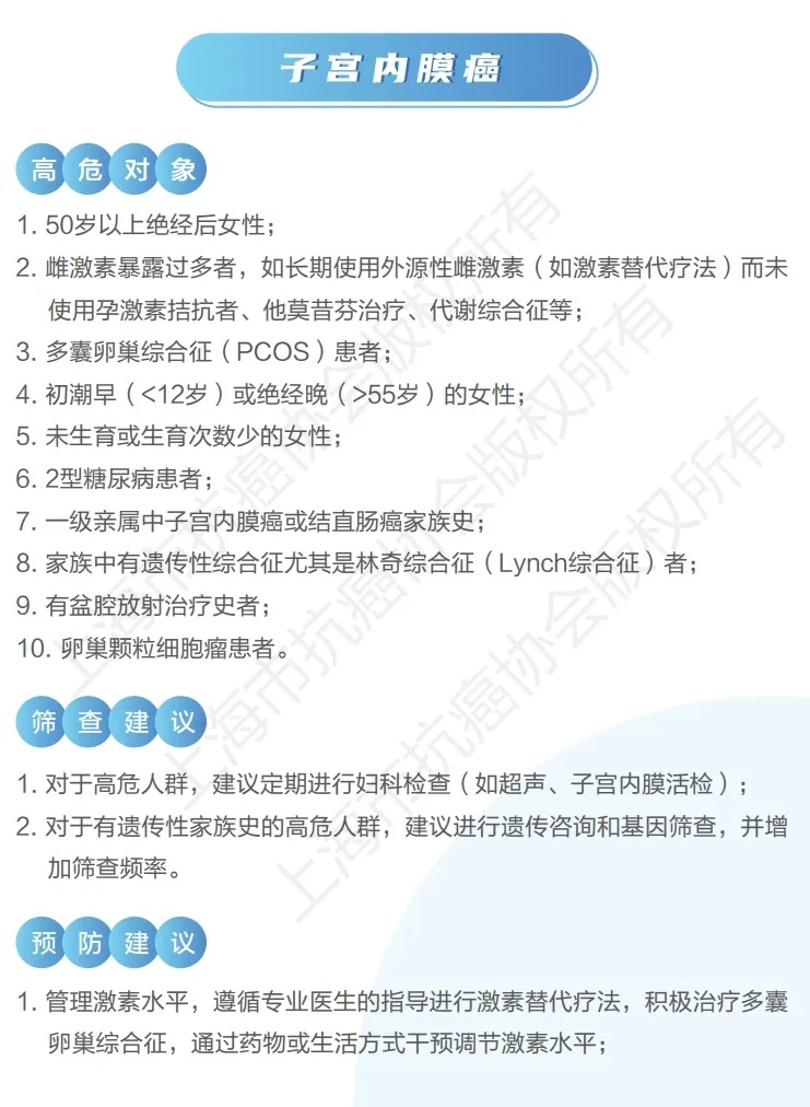 子宫内膜癌:绝经后女性及肥胖、糖尿病等高危人群应关注异常阴道出血,必要时行超声或内膜活检。