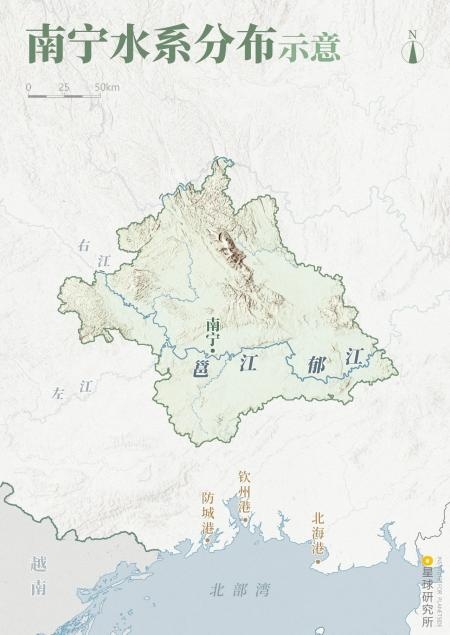 得益于“雨热充沛,四时常青”的亚热带气候,南宁处处绿荫如盖,繁花似锦,被誉为“绿城”。一条大江穿城而过,这就是南宁的母亲河——邕江。邕江西接左江和右江,东连郁江,全长约134千米,流域面积6569平方千米。历史上,南宁自古就是我国西南地区东向的水上通道,商贸发达。清代诗人黄体元曾如是描绘古时邕江两岸的繁忙景象:“大船尾接小船头,北调南腔语不休。照水夜来灯万点,满江红作乱星浮。”作为广西的首府,如今的南宁距离中国西南地区最便捷的出海港——北部湾诸港口,只有一两百千米,是西南出海通道的重要咽喉。
