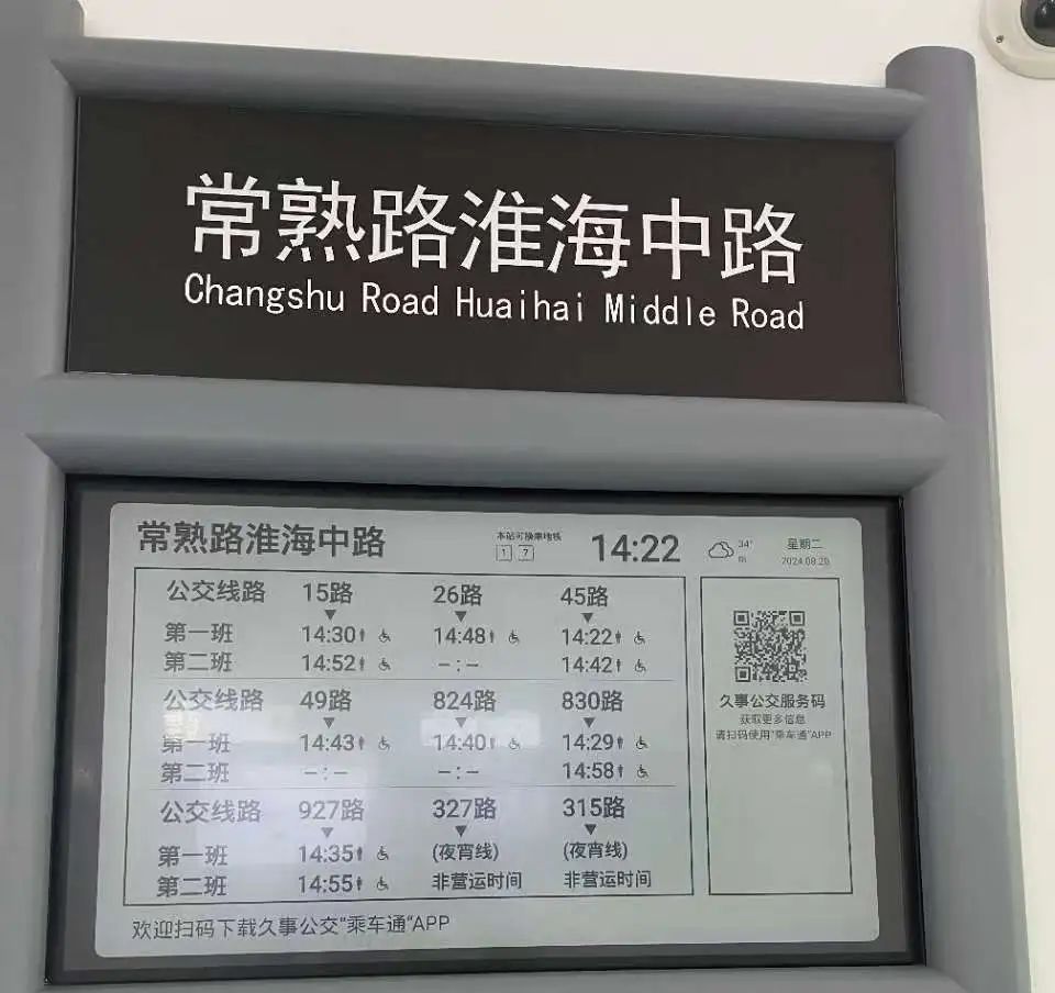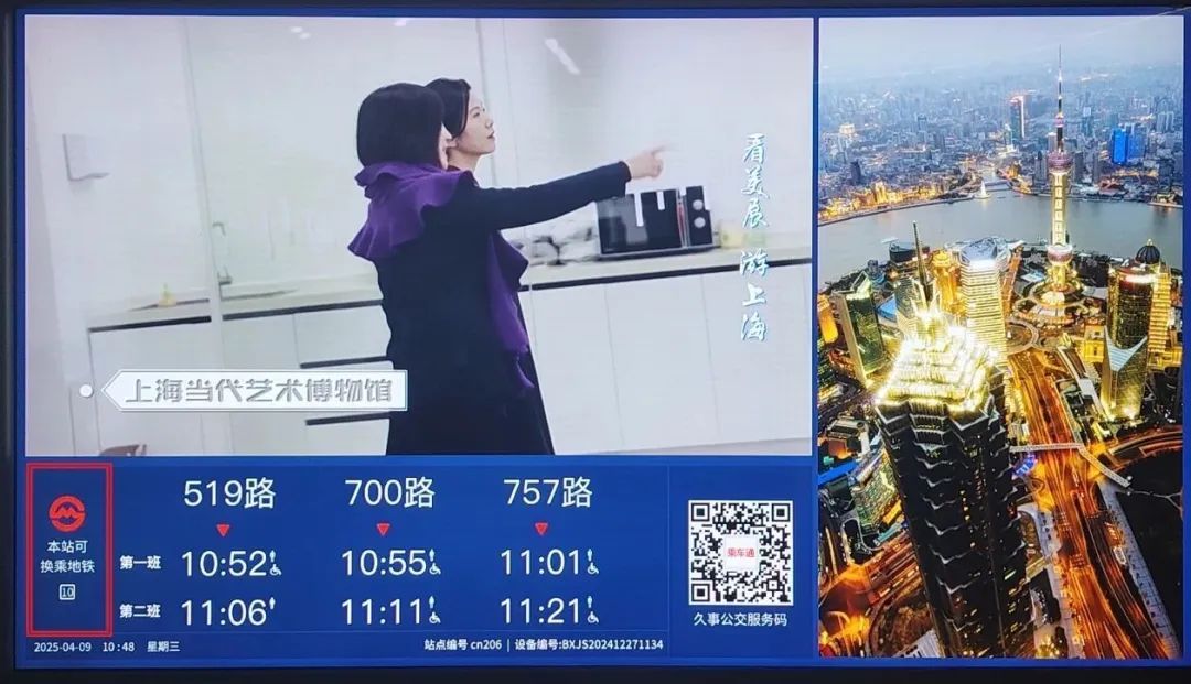 按照“两网融合”要求,市民不仅可以看到即将进站两班车预计到达时间,还可获取站点周边300米范围可换乘的轨交信息,实现公交与轨道交通“零缝隙”接驳指引。此外,市民也可以通过微信扫描屏幕下方的“久事公交服务码”,登录“乘车通”小程序,获得出行规划、充电服务、定制公交征集等更多体验。