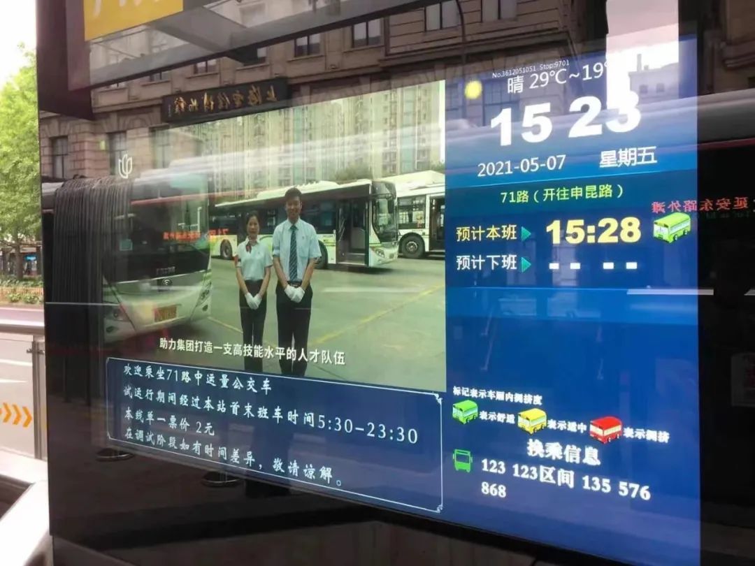 最近,55寸LCD站牌正悄然换新颜~全新设计的电子站牌采用“黄金分割”布局理念,屏幕左上角9:16比例视频区域兼容各类影音视频和多媒体,视觉效果更舒适。右侧新增的图文专区化身“信息橱窗”,实时推送公交线路调整动态、定制公交运营信息等,也可用于媒体广告、各类宣传图文等发布,让乘客在待车时也能便捷获取各类讯息。