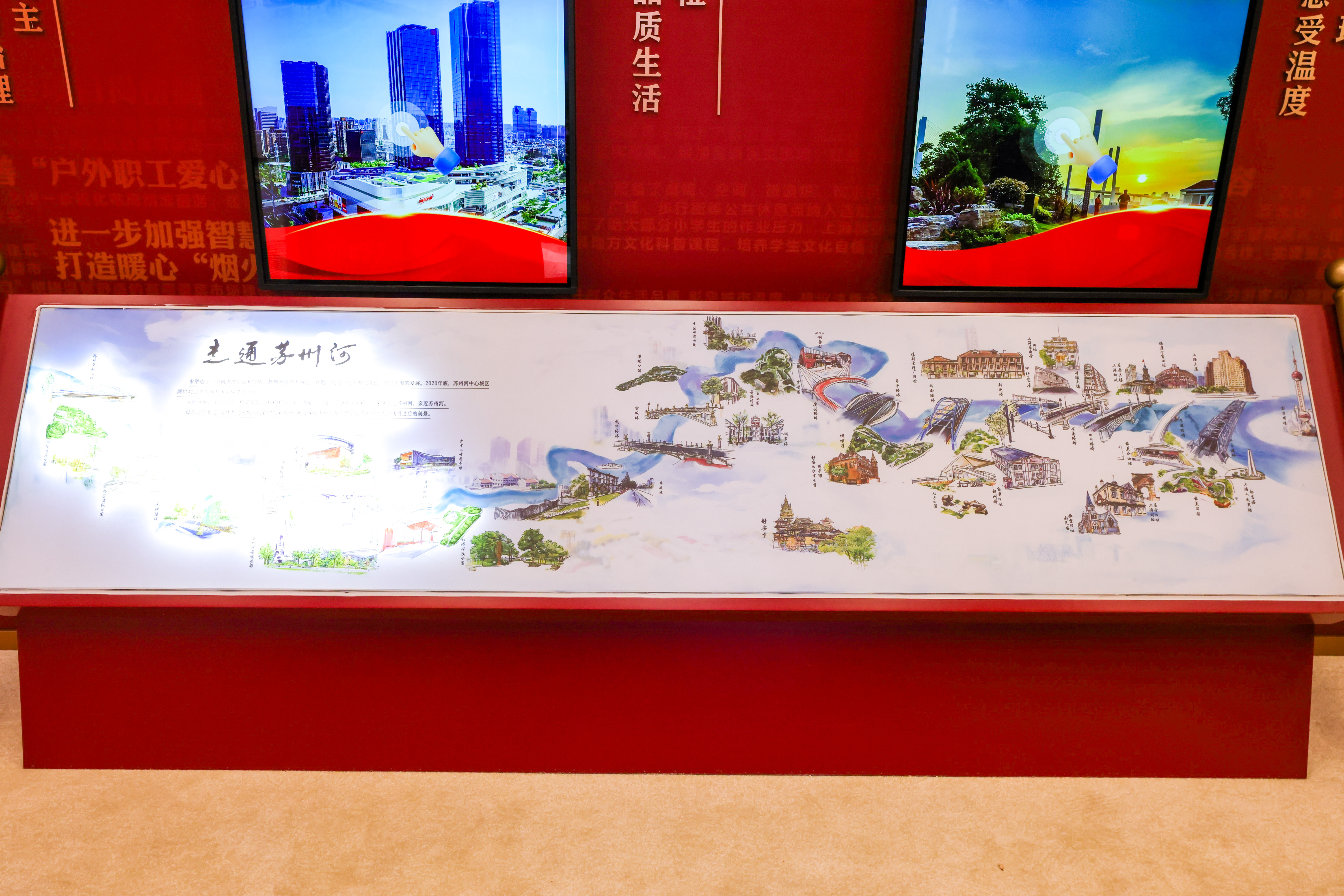 穿过独具“海派韵味”的石库门,走进“人民之城”展厅,首先映入眼帘的便是手绘长卷《走通苏州河》。M50创意园、创享塔、古北路桥、福新面粉厂旧址......苏州河畔的一个个“普陀元素”,如同漫天繁星,将整座城市的历史记忆与绵长文脉串联起来,记录着社会变迁与时代发展中的普陀故事。