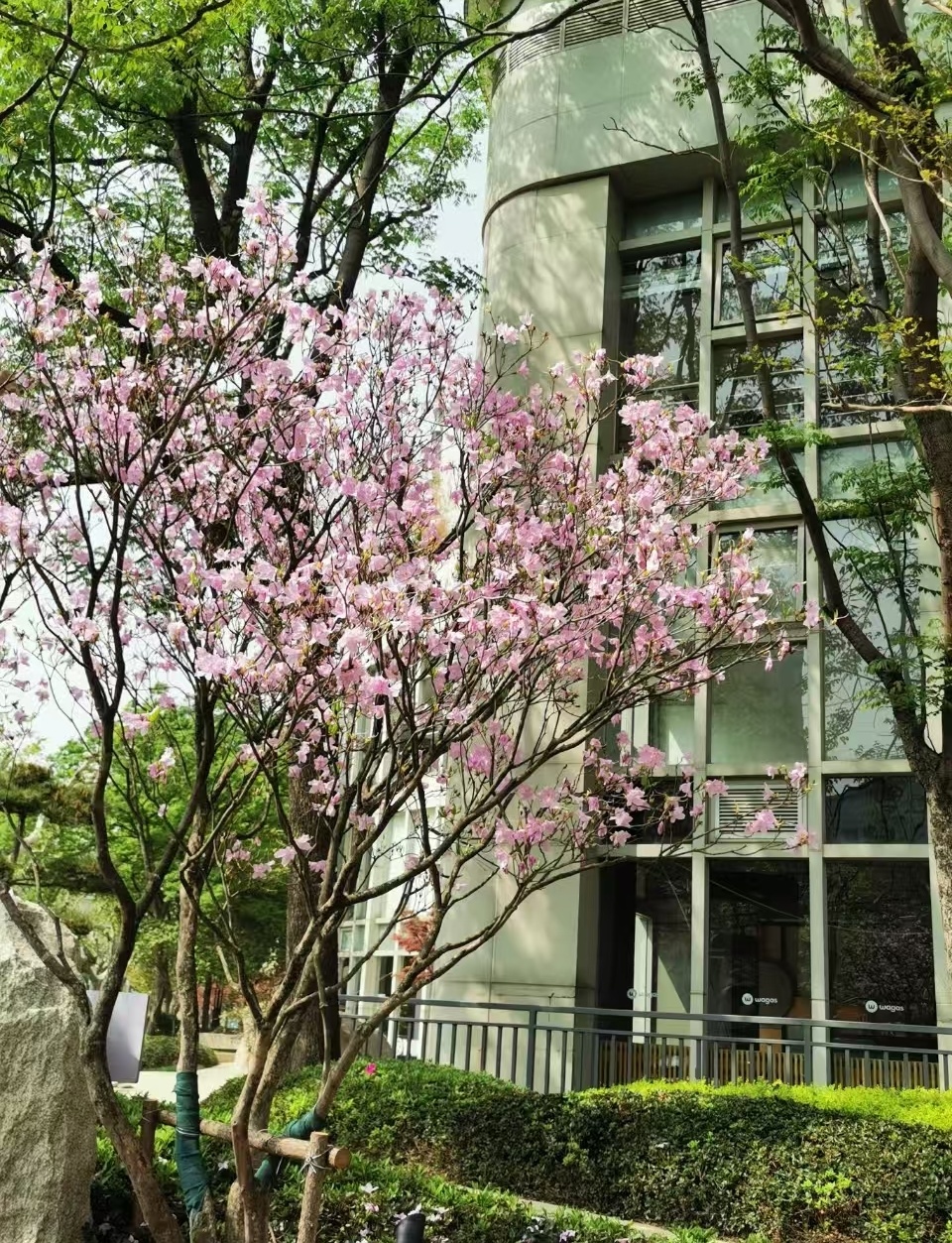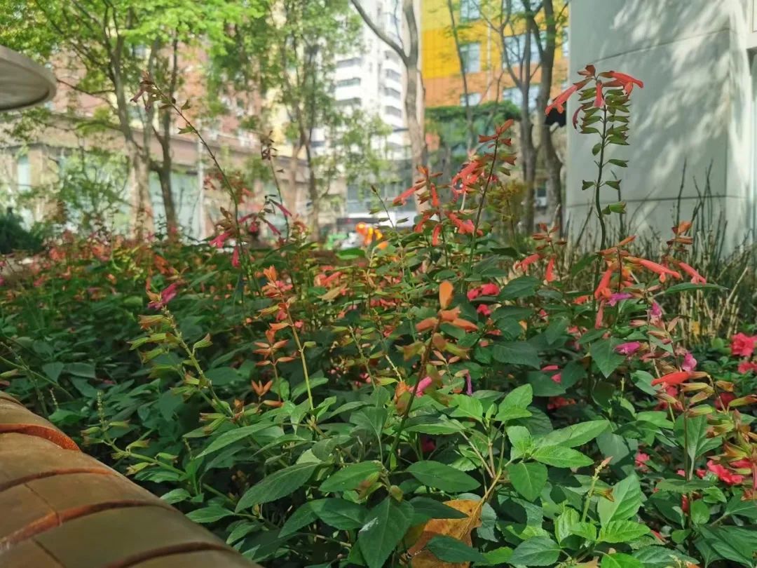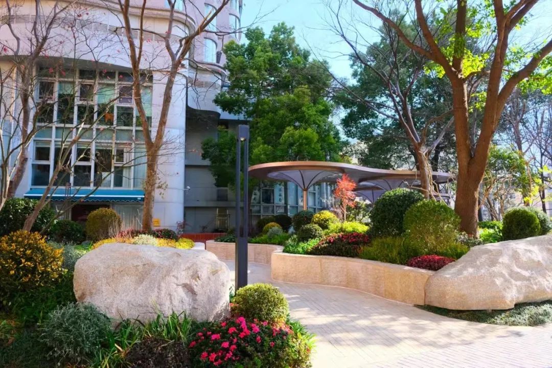 花园原有的大乔木长势良好,是难得的都市绿荫,却影响了下层花灌木的生长,本次改造的重点是将下层绿化分为耐阴地被和具有表现能力的花境两个类型,并在光线条件合适的区域选用了大紫薇、杜鹃等开花特色植物。