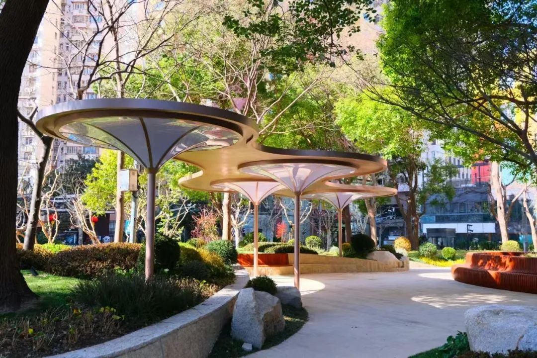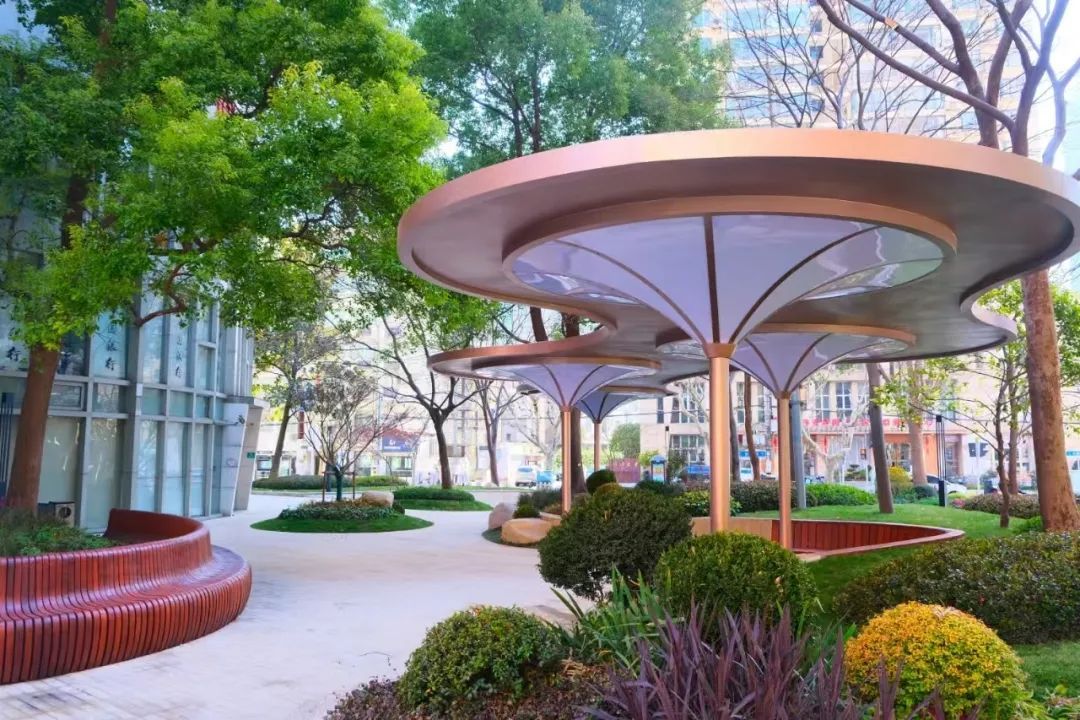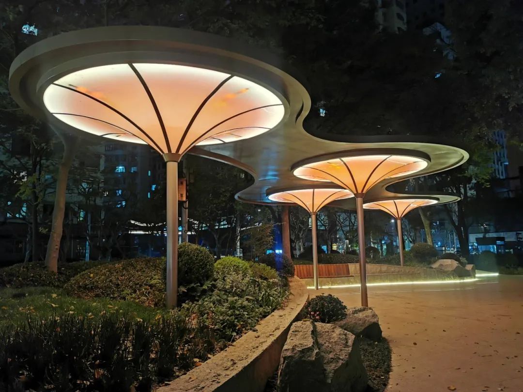 园内新增的艺术廊架采用流线型钢结构重构了云朵意象,通过微螺旋纹路衔接柱体与曲面顶棚,配合智能光影系统,隐喻云卷云舒的自然意象。随着夜幕降临,灯光亮起时,置身于廊架中,抬头如同看见流光溢彩的晚霞,低头是脚下流转的光影画布,用斑斓色彩为街区晕染出诗意氛围。