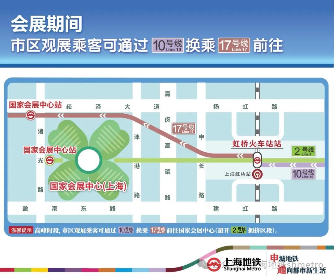 展会期间,由于2号线客流压力较大,建议观展乘客乘坐10号线至虹桥火车站站,再换乘至17号线国家会展中心站前往展馆,从而避开2号线大客流区段。散场时,建议观展乘客在17号线国家会展中心站进站,乘坐1站至虹桥火车站站后,再换乘10号线前往市中心及换乘其他线路。预计本周五将迎来首波客流高峰,届时通勤流叠加观展流,建议乘客通过上述避峰路径出行。
