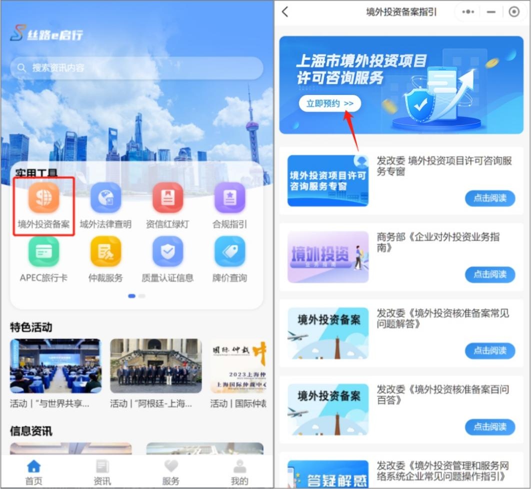 ①扫描二维码或通过微信搜索进入“丝路e启行”小程序,点击“实用工具”——“境外投资备案”,点击顶部的预约入口;