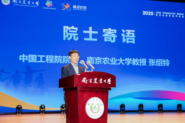 中国工程院院士、南京农业大学教授张绍铃寄语英才学生 启动仪式在南京农业大学滨江校区举办。中国工程院院士、南京农业大学教授张绍铃为本届英才学生送出三句寄语:保持好奇心,时刻要问为什么;勇于实践是最好的成长路径;厚植家国情怀,立志报效祖国。