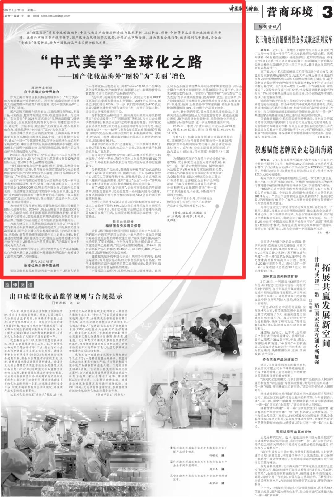 2024年,奉贤海关累计为“东方美谷”化妆品企业提供政策指导20余次,助力化妆品自主品牌通过欧盟CPNP等国际认证,推动8个本土品牌成功出海。