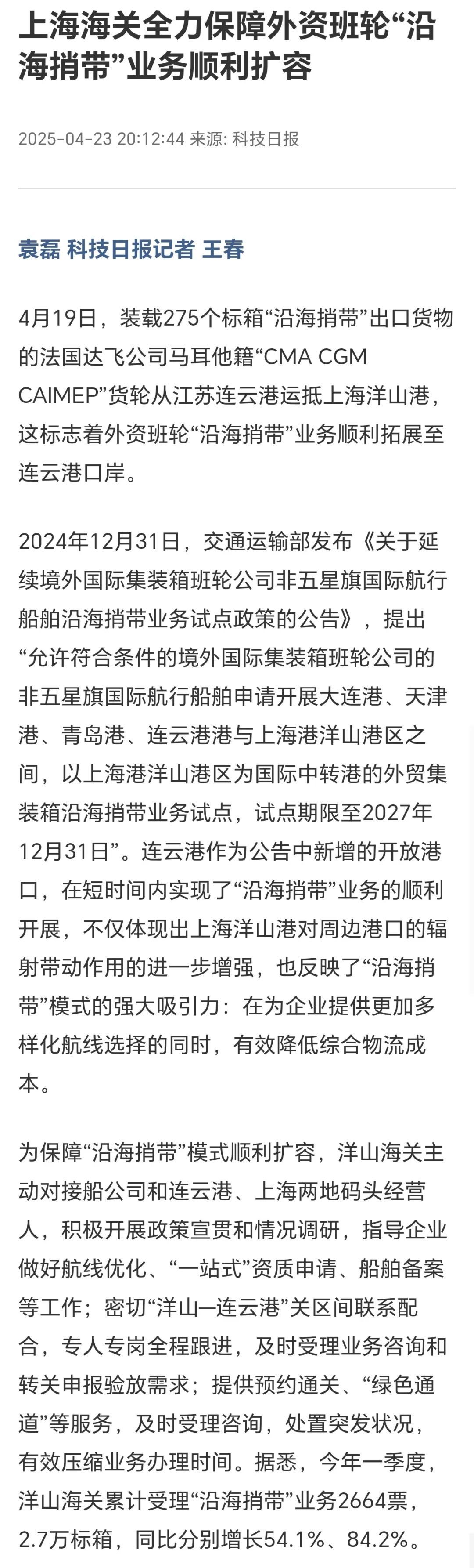 ●05 上海海关全力保障外资班轮“沿海捎带”业务顺利扩容(科技日报、上观新闻)