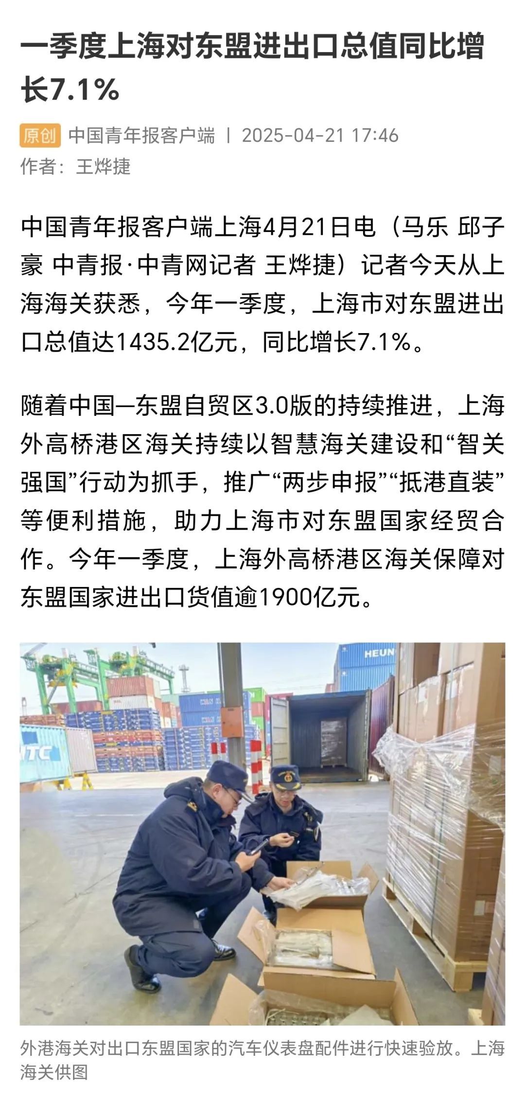 ●02 今年一季度上海对东盟进出口总值同比增长7.1%(中国青年报、央视财经、央视新闻、新华社、上海电视台、上观新闻、中新社、新民晚报)