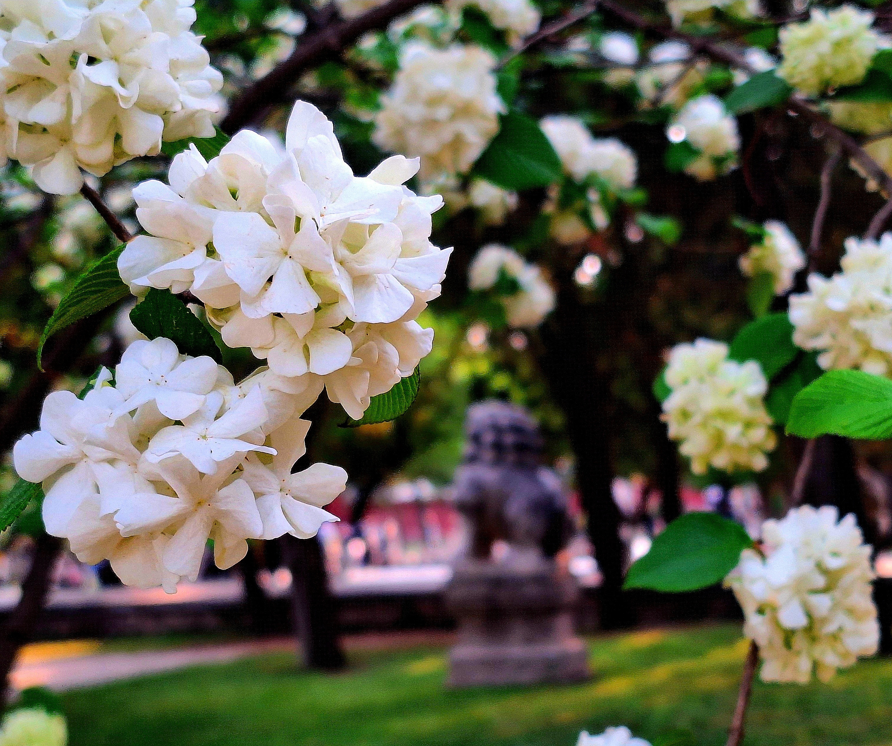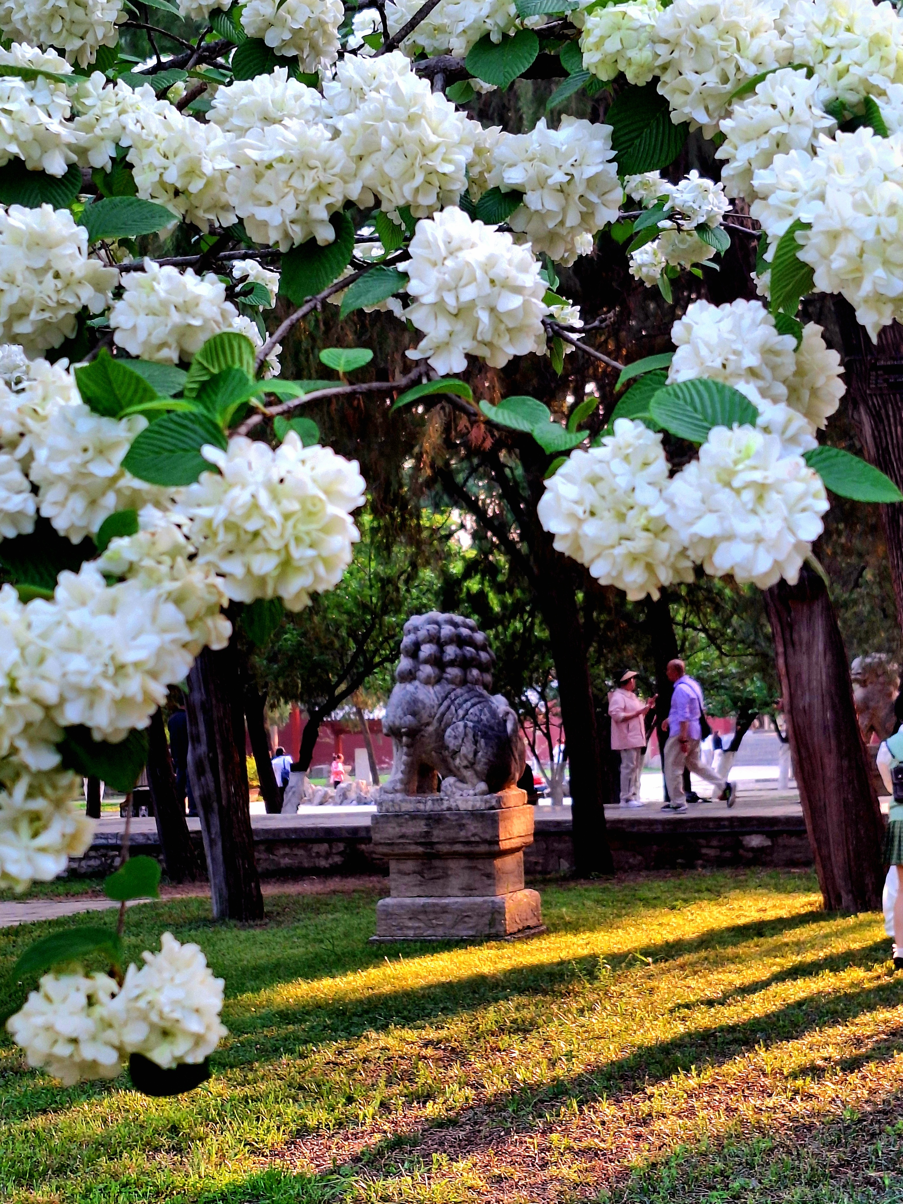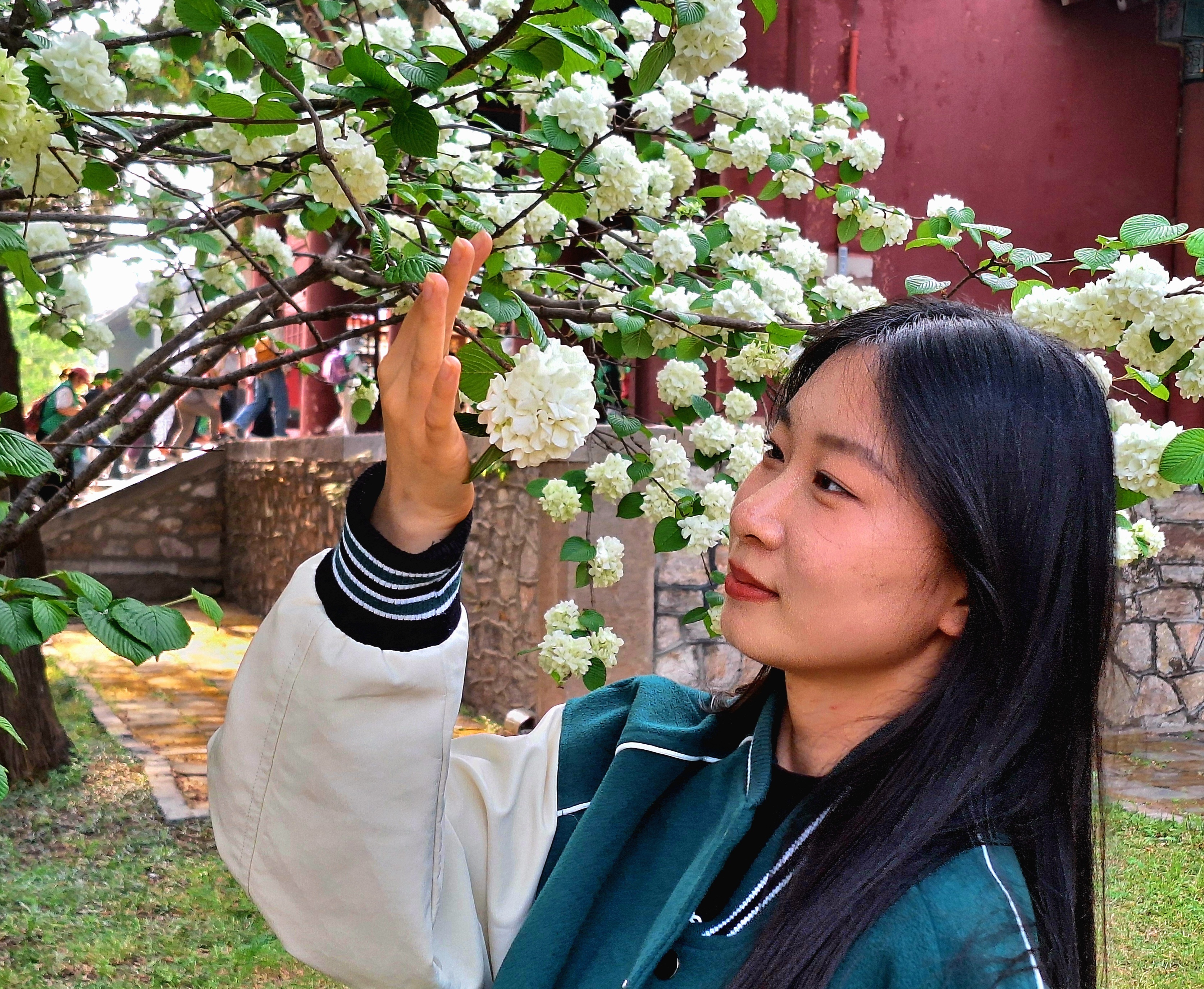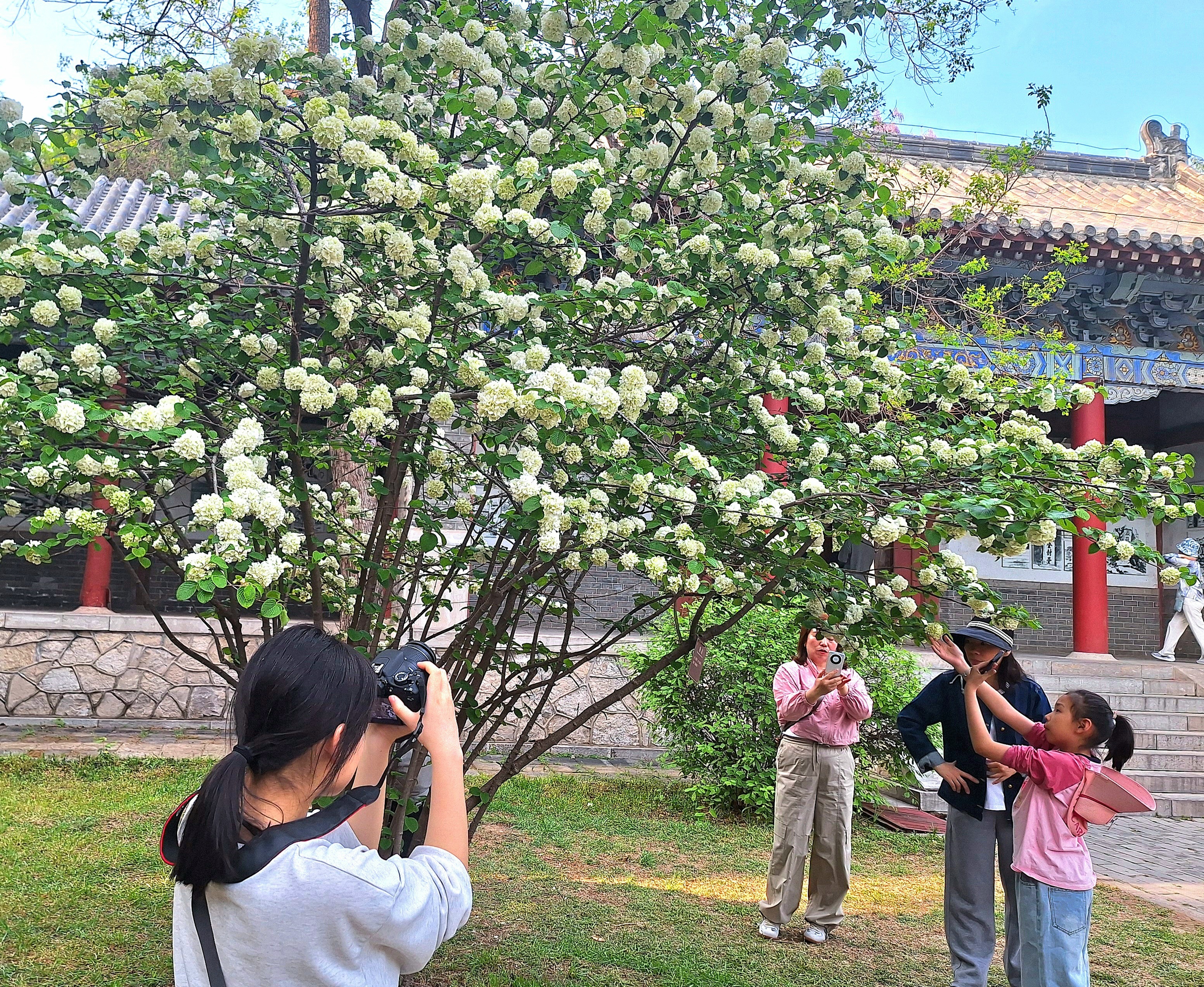 暮春时节,泰安岱庙仁安门前东侧院落,两株百年雪球荚蒾迎来盛放高峰。如云似雪的花团缀满枝头,与红墙黛瓦的古建筑相映成趣,清甜花香随风浮动,吸引众多游客驻足拍照,成为春日岱庙的网红打卡胜景。