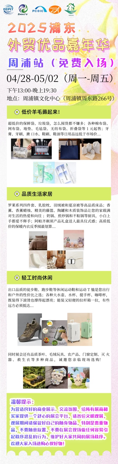 面对复杂严峻国际形势,国内市场是外贸企业的坚强后盾。为帮助外贸企业畅通内销渠道,助力稳外贸、扩消费,浦东即将开展2025外贸优品嘉年华。首站活动选址周浦镇文化中心,从4月28日持续至5月2日,每天13:00-19:30面向市民开放。