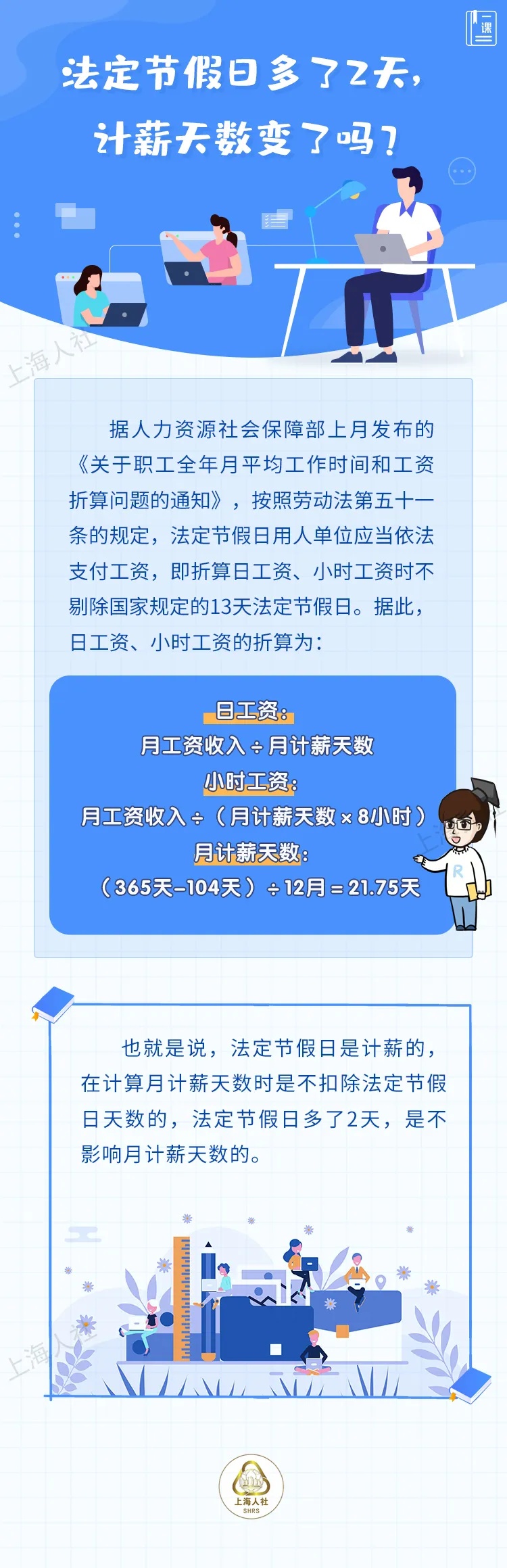 月计薪天数:(365天-104天)÷12月=21.75天