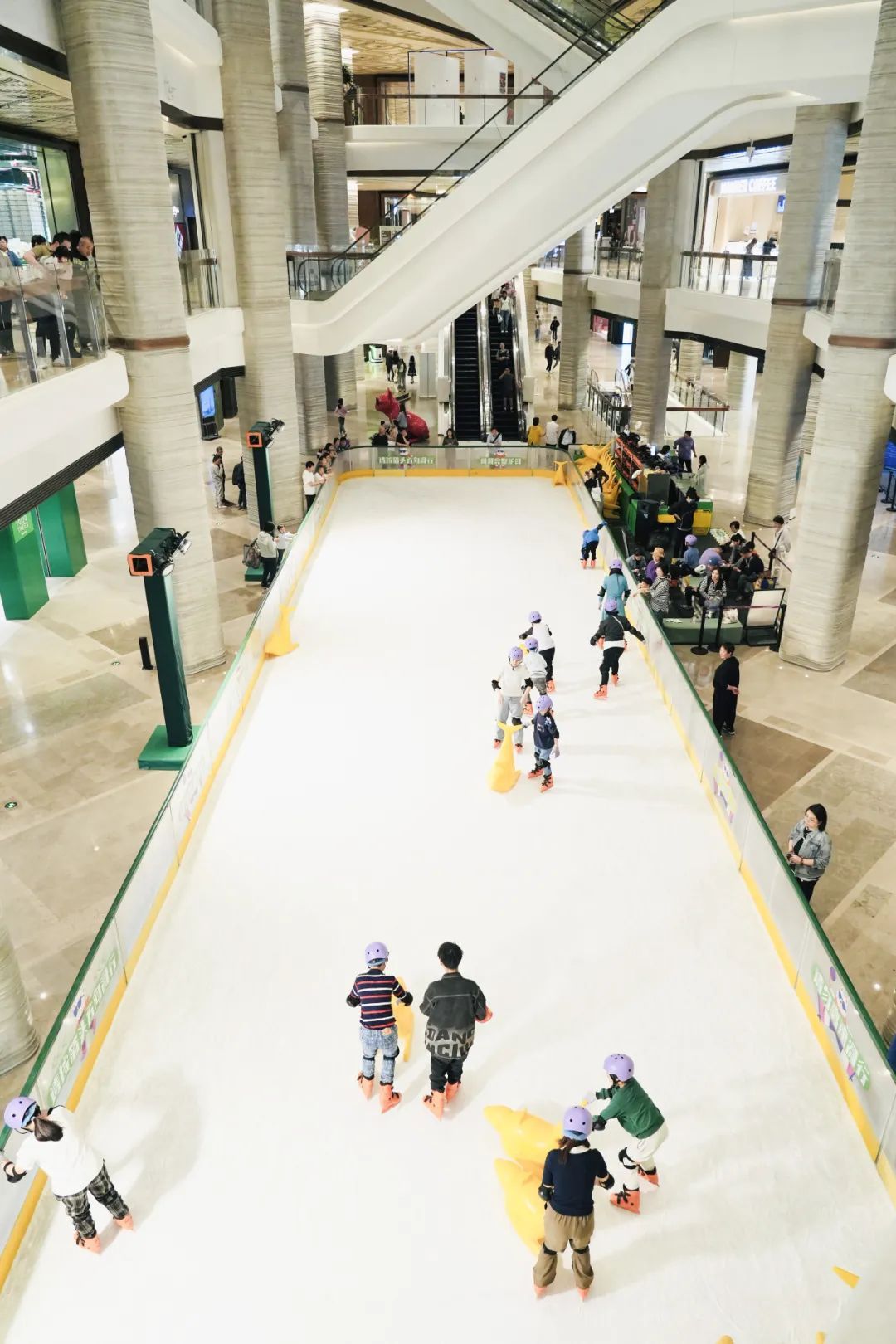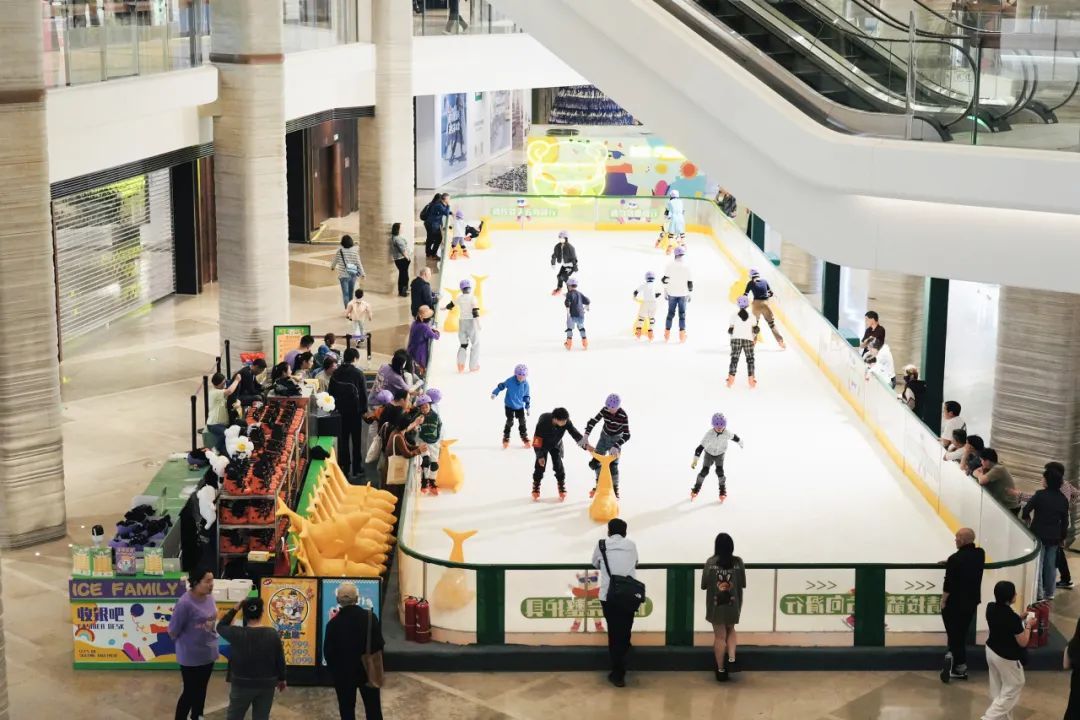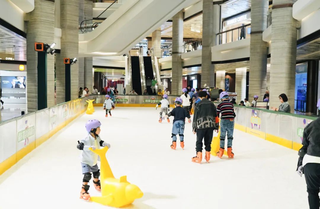 这片260平方米的滑冰场位于商场L层中庭,冰面洁白,现场围砌了一圈防护栏,旁边的照明灯把这里照得十分明亮,便于小朋友们滑冰。滑冰场入口处还设置了简单的更衣区,现场各类防护器具齐全。