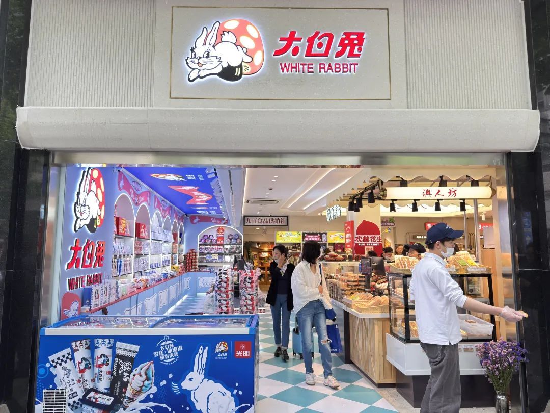 新店升级开业后,有不少年轻父母带着孩子前来“寻味”童年回忆。门口的大白兔冰柜里盛放着满满的小辰光味道,光明冰砖、大白兔冰淇淋、大白兔雪糕、三色杯,吸引不少路过的市民游客驻足。