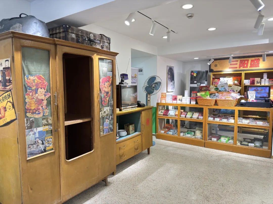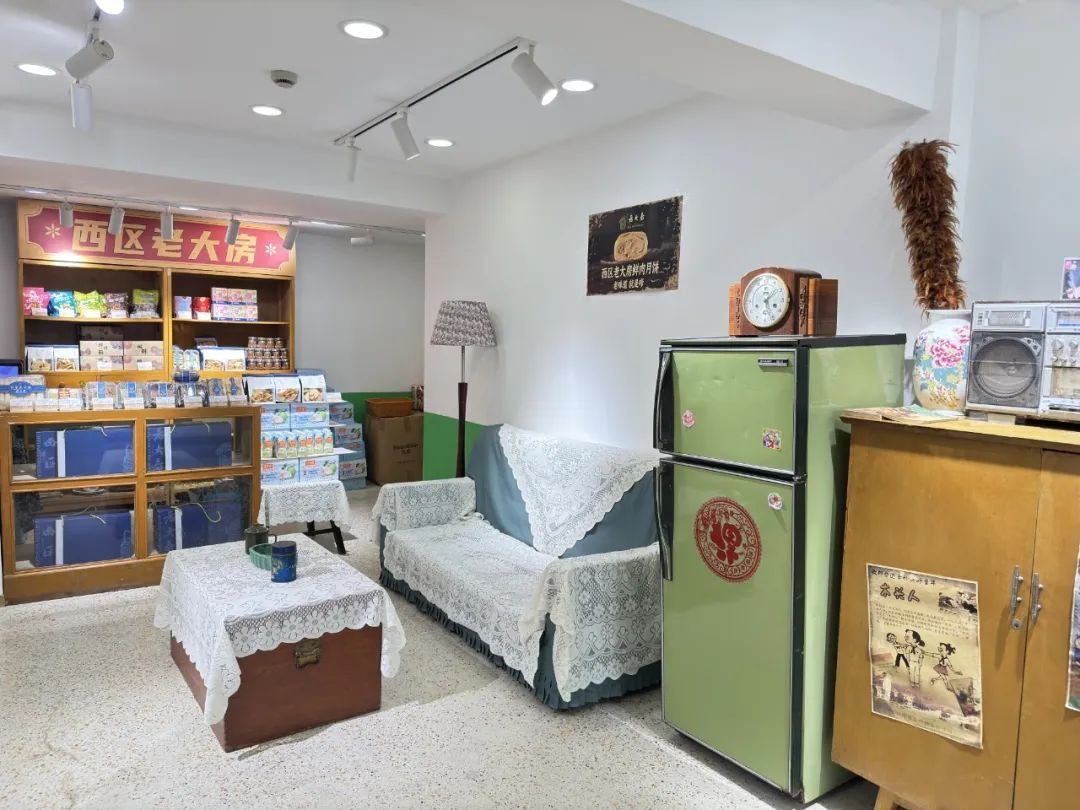 往里走,店内还隐藏着一处怀旧主题场景空间,仿佛走入老上海人家的客厅,老式冰箱、收音机、电视、橱柜……扑面而来满满的“回忆杀”。怀旧空间内融合了九百集团旗下西区老大房、三阳盛、阿咪等老字号品牌的经典产品和创新产品,经典与潮流在此碰撞出别样火花。
