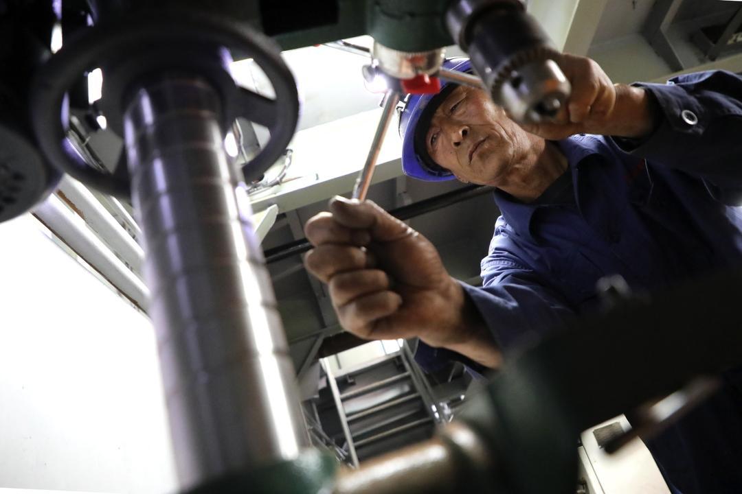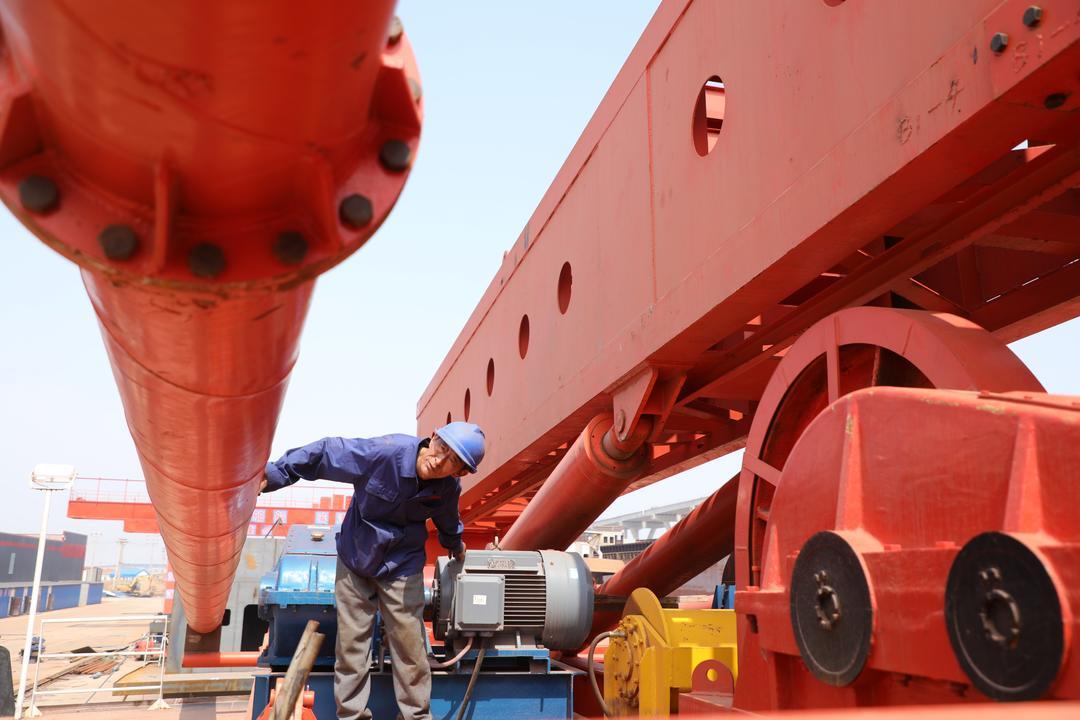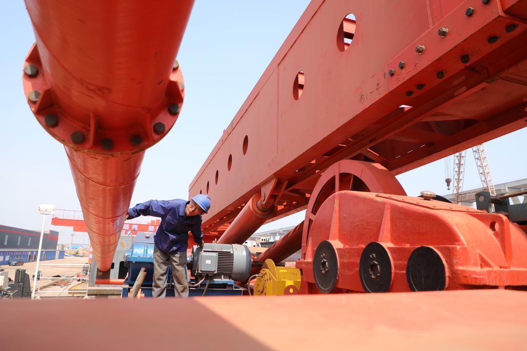 5月10日,在无棣县东风港经济园区船舶平台上,津滨船舶重工公司的电工正在检查海上光伏打桩船瑞褀2号打桩机的线路。近日,由滨州企业自主设计建造的海上光伏打桩船瑞褀2号完成建造,将于6月初交付使用。这标志着滨州造海上光伏打桩船成功实现升级换代。