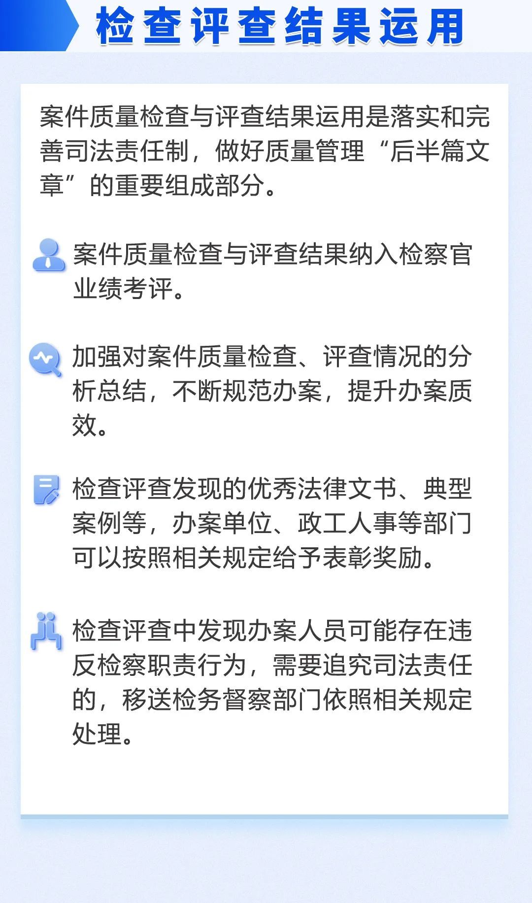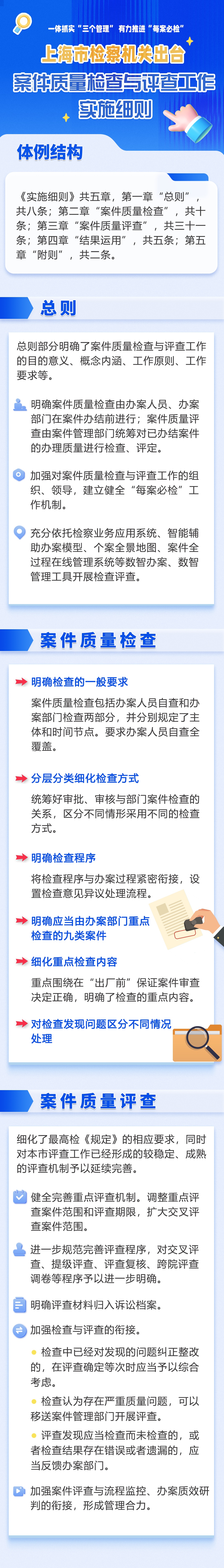 为全面准确落实司法责任制,一体抓实“三个管理”,有力推进“每案必检”,日前,上海市检察机关根据最高检《人民检察院案件质量检查与评查工作规定(试行)》,充分吸收基层院全覆盖案件质量检查与评查工作机制的探索实践经验,出台《上海市检察机关案件质量检查与评查工作实施细则(试行)》。