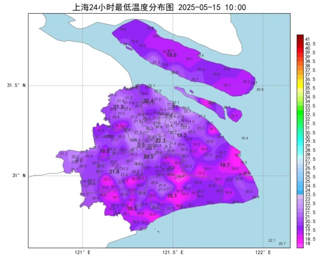 气温不低,早间大部分地区最低气温在18℃-22℃之间,市区徐家汇站22.3℃,预计最高气温30℃。气温偏高、湿度大,体感有些闷热、不太舒适。
