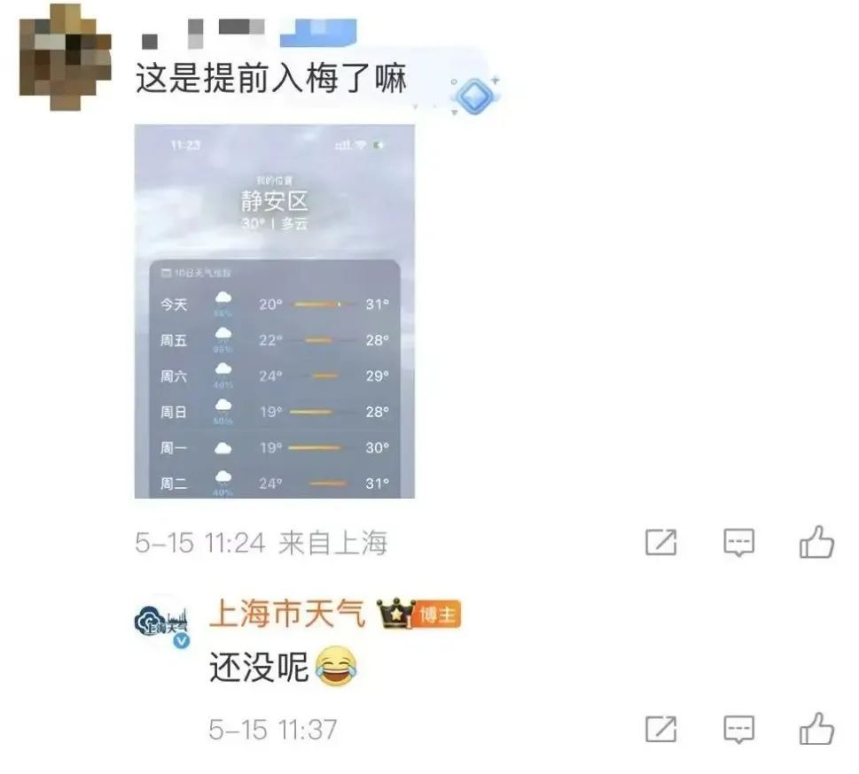 对此,有网友提问,这是提前入梅了吗?@上海市天气 回复表示,上海还未入梅。