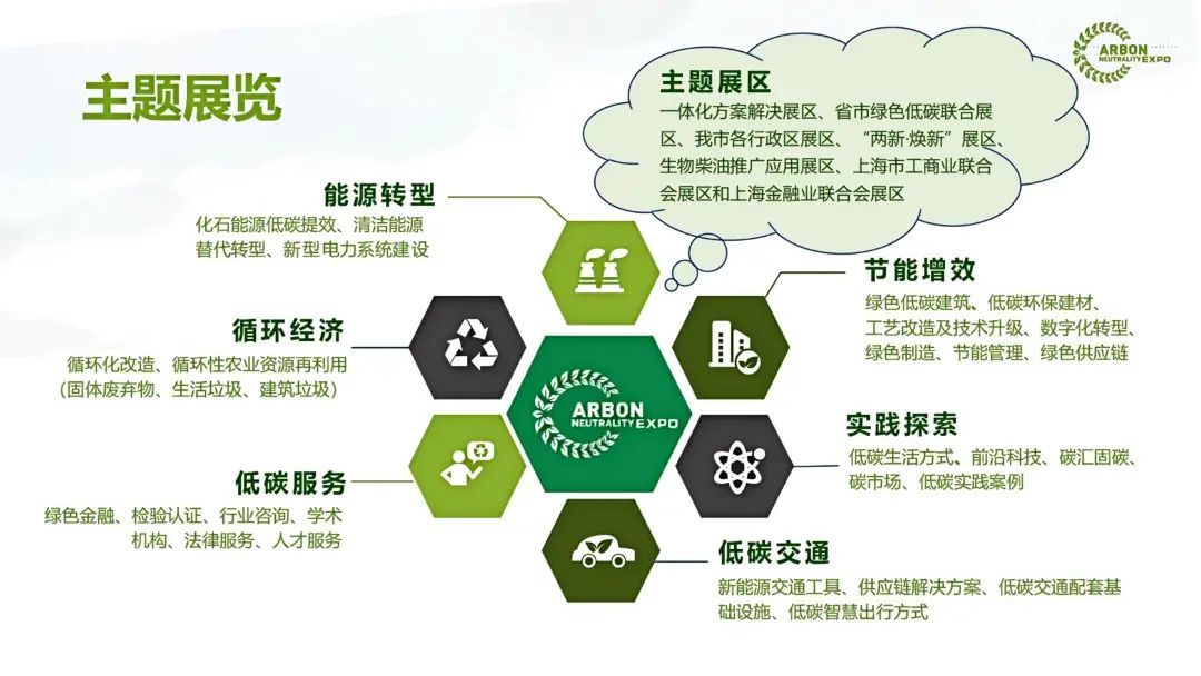 主题展览覆盖能源转型、低碳交通、节能增效、循环经济、低碳服务、实践探索六大板块,同时设立我市各行政区专区、一体化解决方案专区、“两新·焕新”专区、上海市工商业联合会专区、生物柴油推广应用专区、上海金融业联合会专区和省市绿色低碳联合展区。各专区以“小而精”的规模,实现“专而强”的突破。