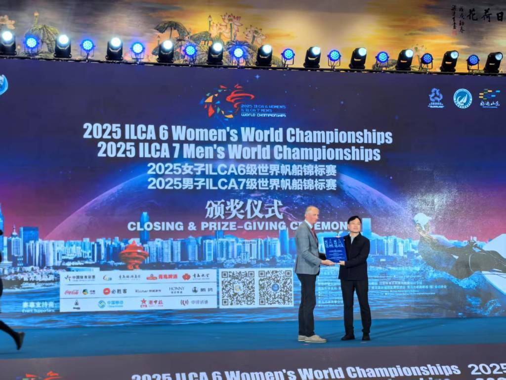 现场,国际ILCA级别协会向世界帆船联合会、中国帆船帆板运动协会、山东省体育局、青岛市体育局赠送感谢牌。